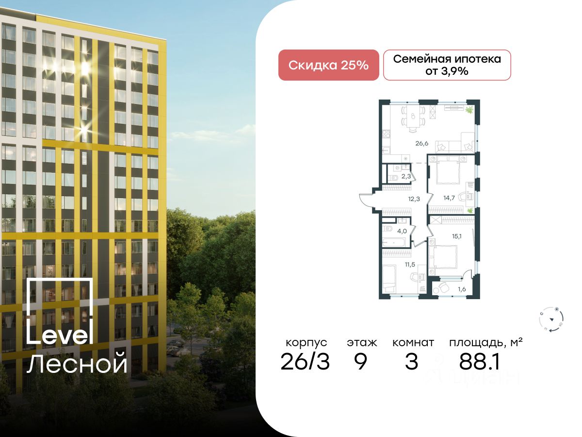В районе, утопающем в густой зелени лесов, многочисленных парков и скверов, продаётся 3-комнатная квартира площадью 88.10 кв.м без отделки. Квартира расположена на 9 этаже в жилом комплексе комфорт-класса Level Лесной (компания Level Group/Левел групп).