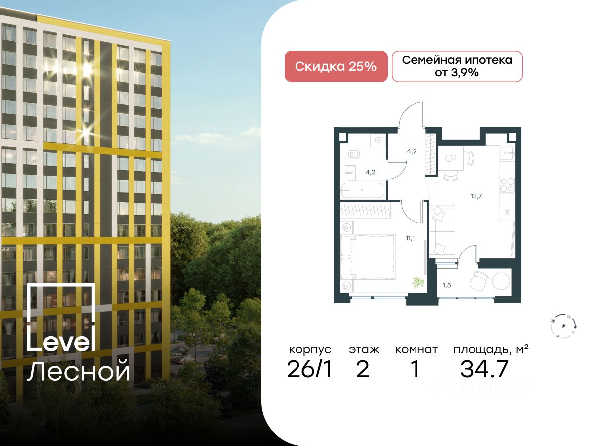 В районе, утопающем в густой зелени лесов, многочисленных парков и скверов, продаётся 1-комнатная квартира площадью 34.70 кв.м с отделкой white box. Квартира расположена на 2 этаже в жилом комплексе комфорт-класса Level Лесной (компания Level Group/Левел групп).