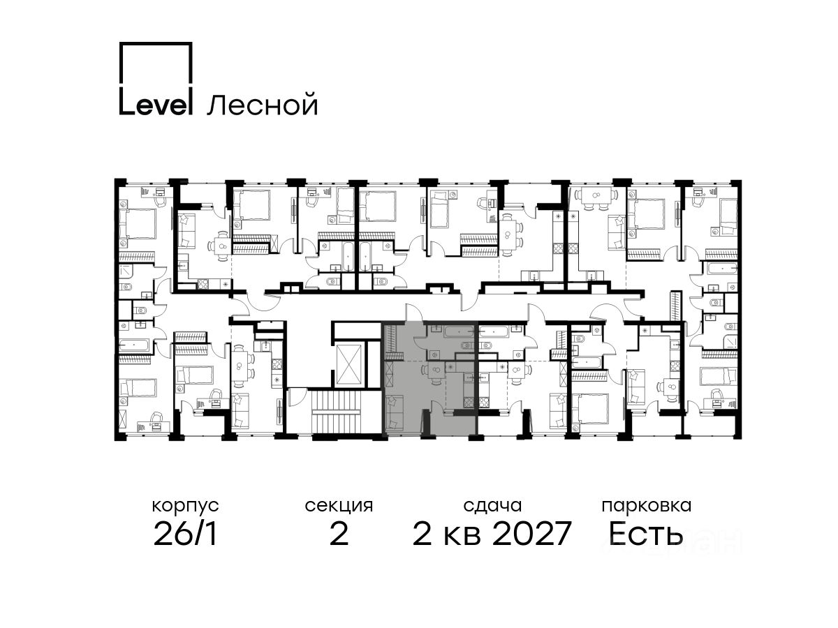 В районе, утопающем в густой зелени лесов, многочисленных парков и скверов, продаётся студия площадью 26.90 кв.м с отделкой white box. Квартира расположена на 9 этаже в жилом комплексе комфорт-класса Level Лесной (компания Level Group/Левел групп).