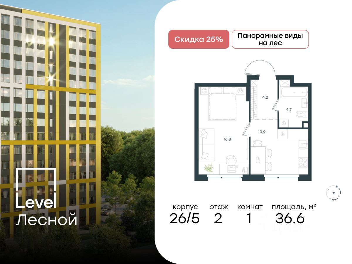 В районе, утопающем в густой зелени лесов, многочисленных парков и скверов, продаётся 1-комнатная квартира площадью 36.60 кв.м с отделкой white box. Квартира расположена на 2 этаже в жилом комплексе комфорт-класса Level Лесной (компания Level Group/Левел групп).