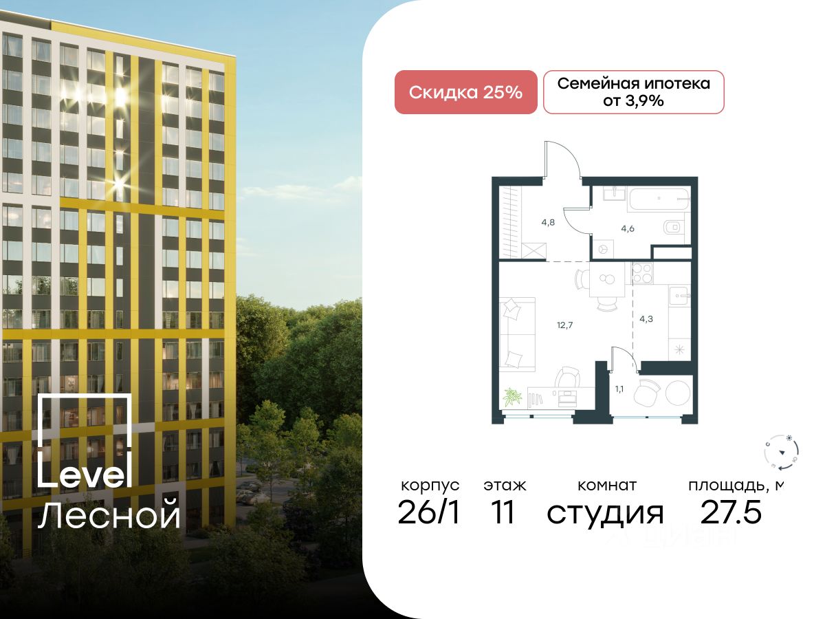 В районе, утопающем в густой зелени лесов, многочисленных парков и скверов, продаётся студия площадью 27.50 кв.м с отделкой white box. Квартира расположена на 11 этаже в жилом комплексе комфорт-класса Level Лесной (компания Level Group/Левел групп).