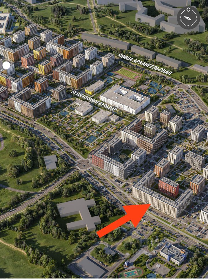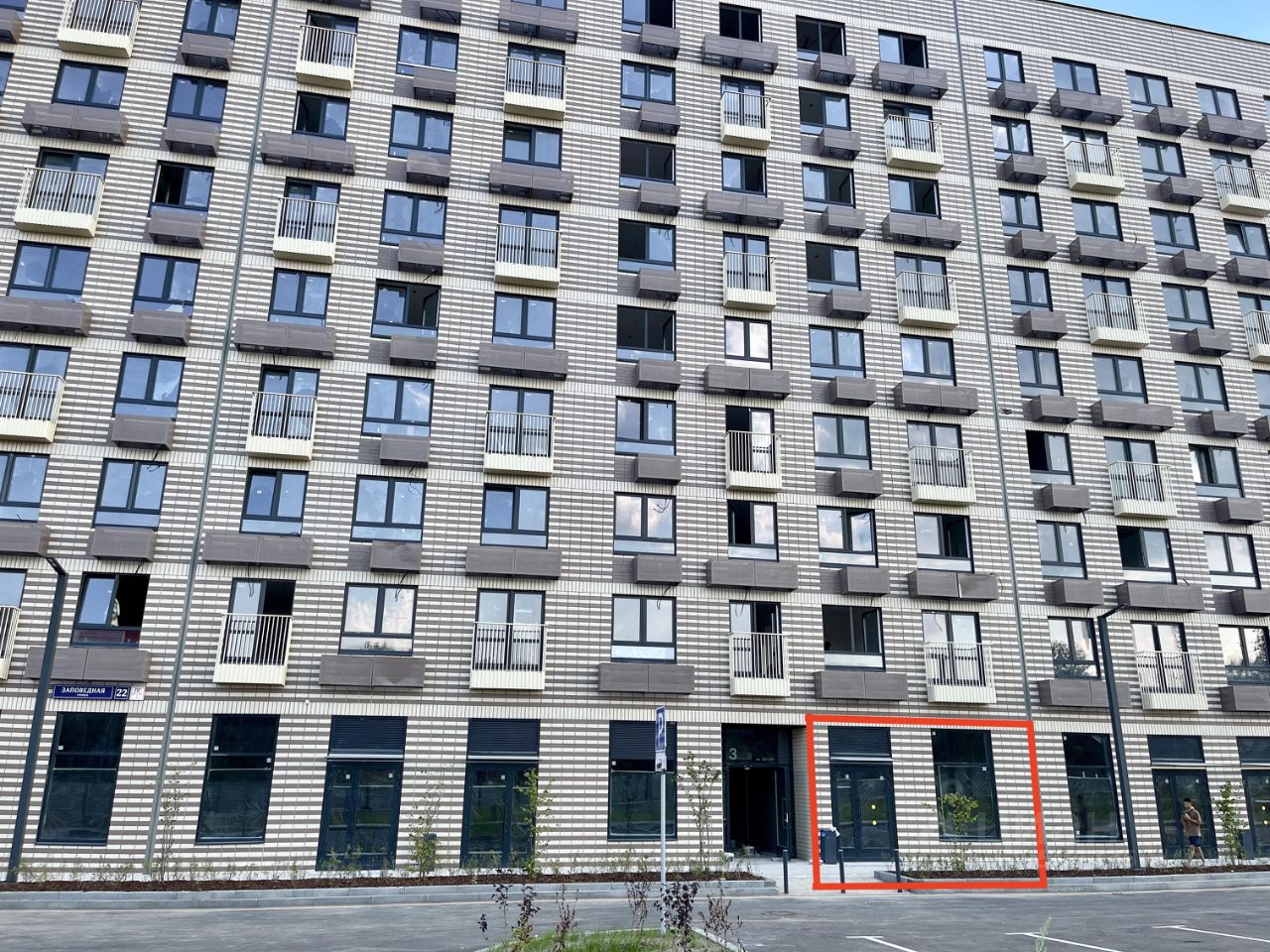 Помещение располагается в центре жилого массива на главной пешеходной аллее с видом на главную улицу Заповедную. В двух минутах ходьбы строится самая большая школа в жилом комплексе.