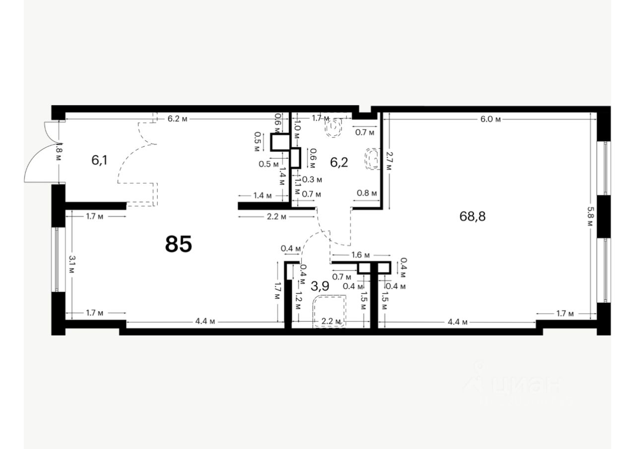 Помещение 85м2 располагается на 1 этаже, открытая планировка, отдельный вход с фасада, высота потолка 5 м, витринные окна по фасаду.