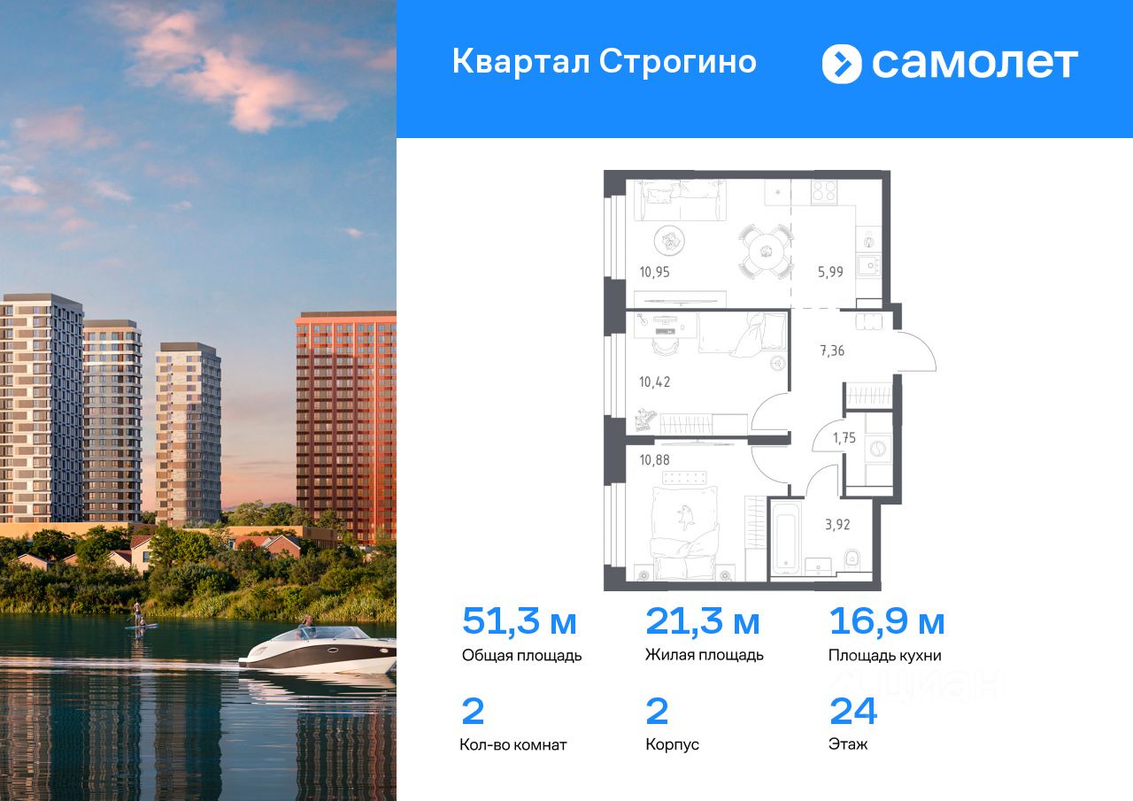 Предлагается 2-комнатная квартира комфорт-класса 51,27 кв.м в корпусе 2 на 24 этаже, в ЖК ''Квартал Строгино'' Квартира с чистовой отделкой. Доступность дополнительных опций уточняйте у застройщика.