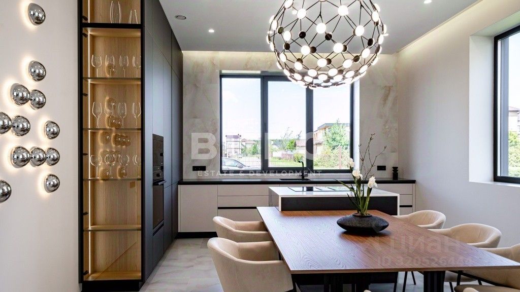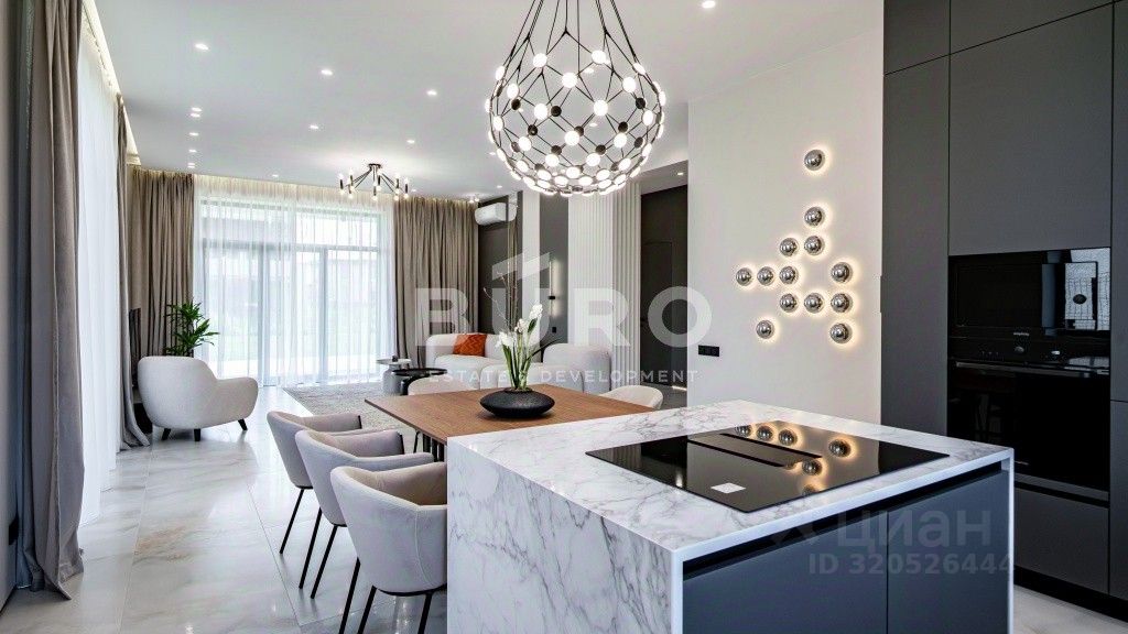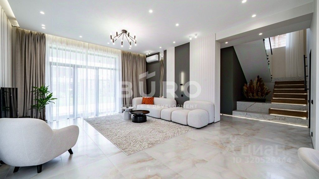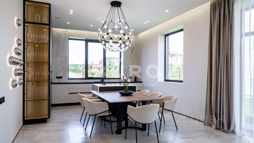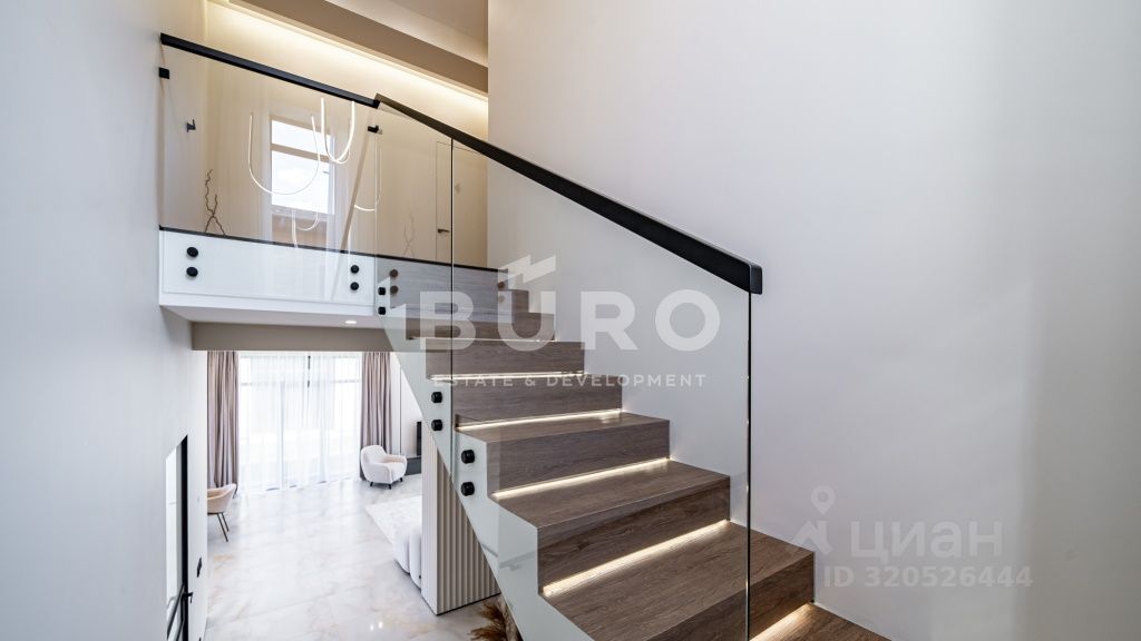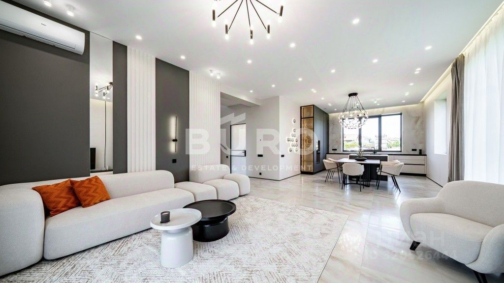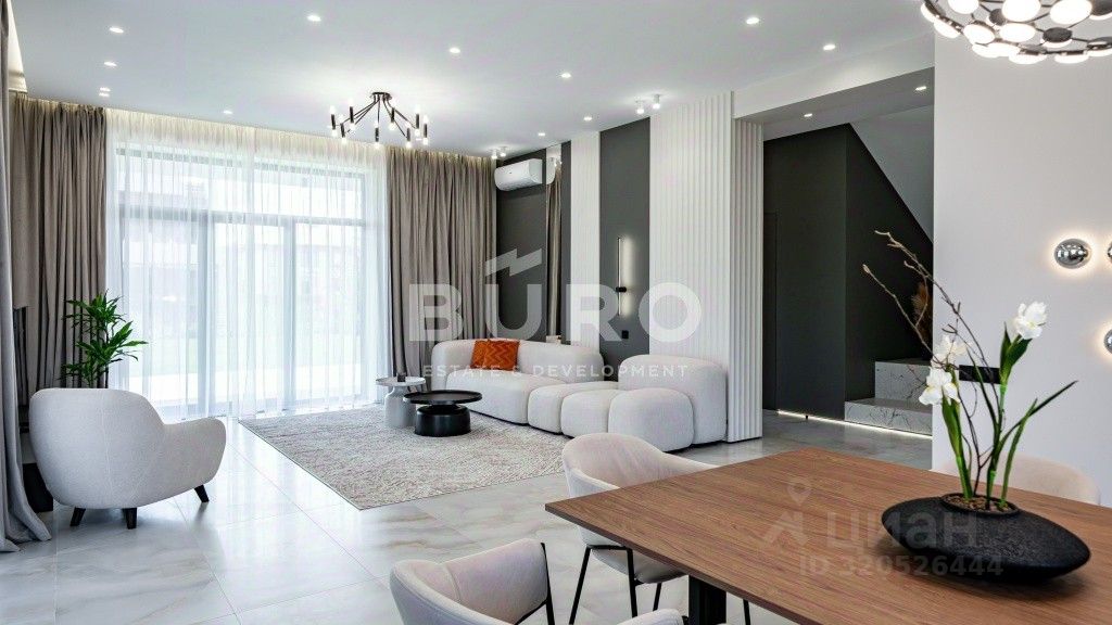 Монолитные перекрытия и фундамент гарантируют прочность и долговечность конструкции здания. На плоской кровле уложена надежная мембрана. В доме выполнен дизайнерский ремонт с применением премиальных отделочных материалов. Современный интерьер укомплектован стильной мебелью и элементами декора. Эффектная лестница на второй этаж с подсветкой и стеклянными перилами гармонично дополняет оформление.