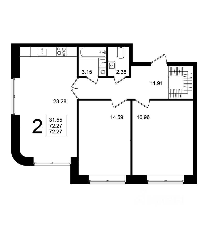 Продаётся 2-комнатная квартира в строящемся доме (Корпус 6), срок сдачи: 4-кв. 2025, общей площадью 72.27 кв.м., на 1 этаже.