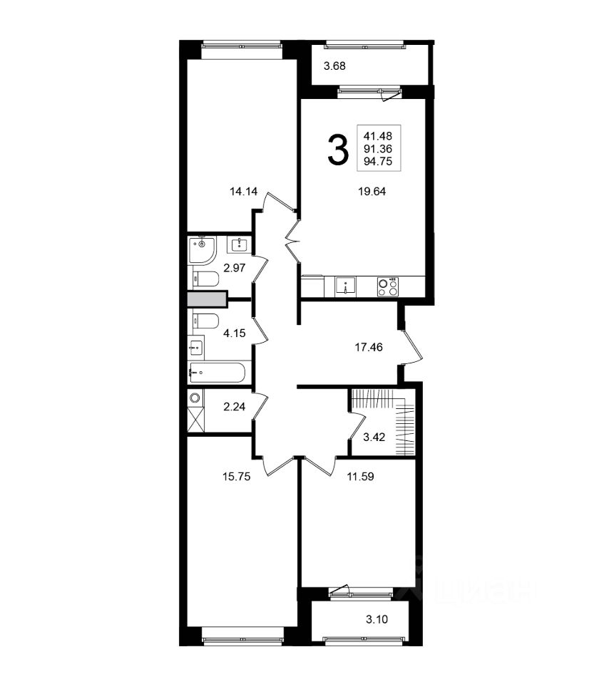 Продаётся 3-комнатная квартира в строящемся доме (Корпус 7), срок сдачи: 4-кв. 2025, общей площадью 94.75 кв.м., на 1 этаже.