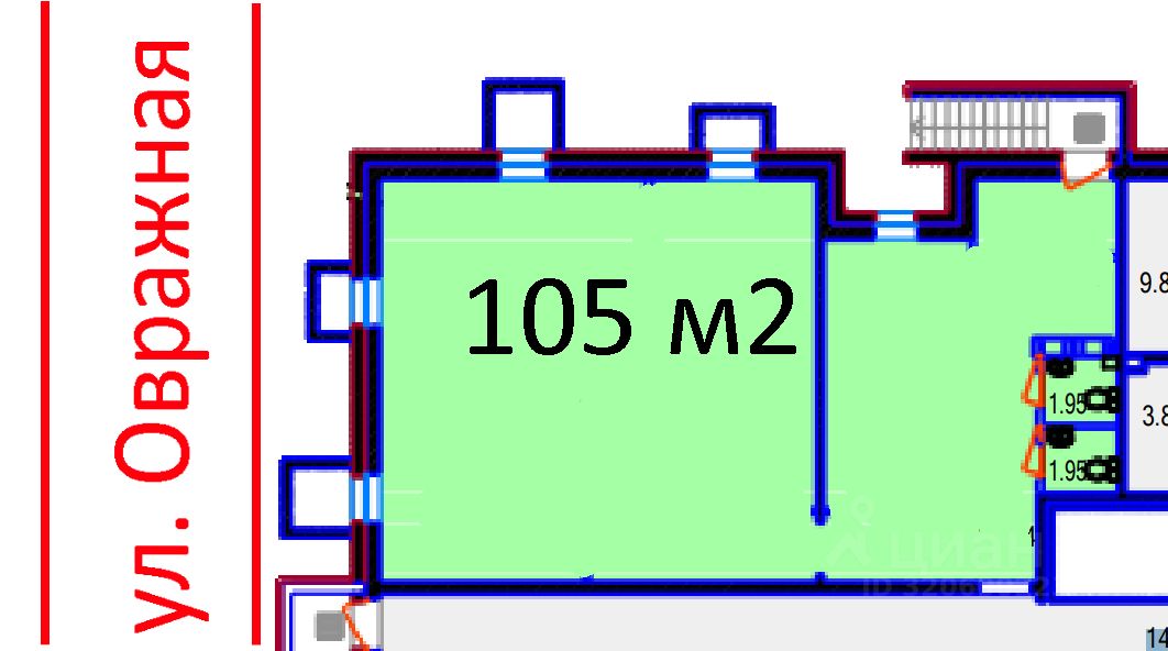 Общая площадь -105 м². Предлагаемое помещение расположено на цокольном этаже (высокий этаж с окнами) жилого Дома. Высота потолков 3 м.