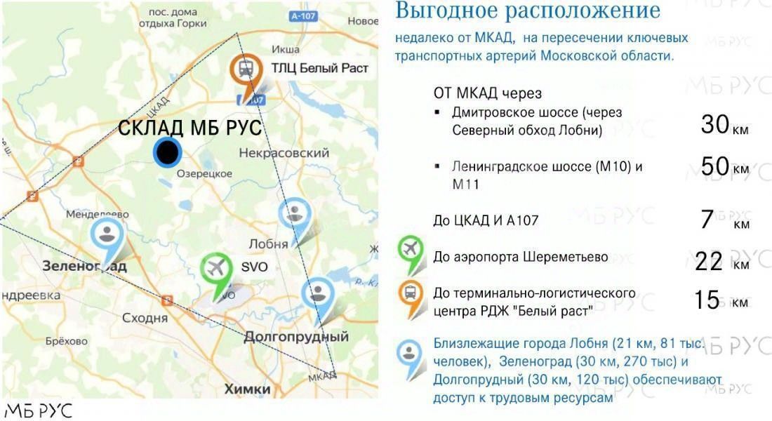 Лот 908527 Предложение от Собственника! Продается Склад класса ''А'' Мерседес-Бэнц РУС в Глазово - Индустриальный парк ''Северное Шереметьево'' общей площадью 51 631,3 м2 Основные характеристики: Расстояние до МКАД 30 км Сдан в эксплуатацию: июль 2016 Индивидуальный проект застройки крупнейшего мирового автопроизводителя. Функциональная инфраструктура, высокое качество отделки и оборудования. Площадь земельного участка - 15,7 га (позволяет расширить складские площади до 67 700 м2) Площадь по внутреннему. обмеру - 51 631,3 м2 (вкл.