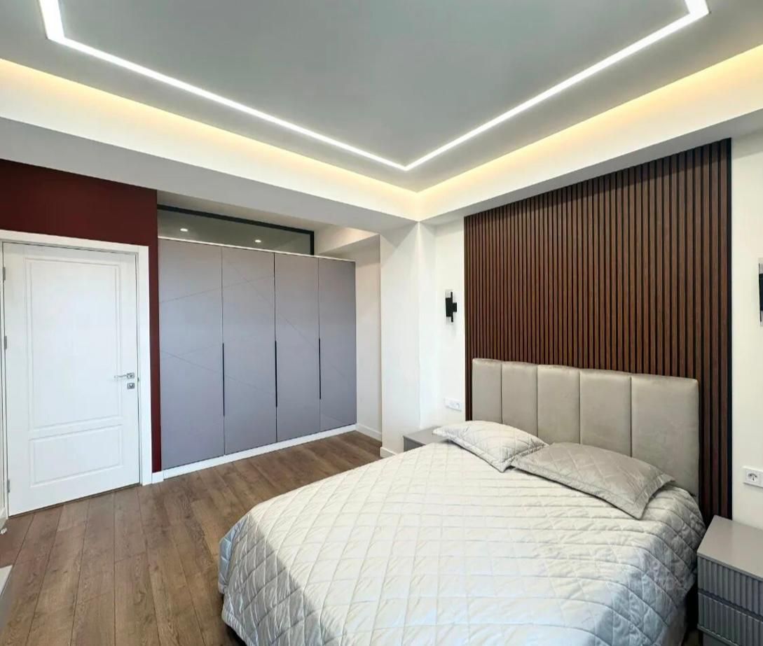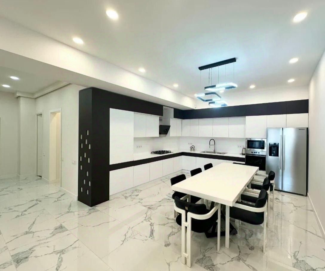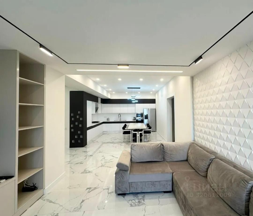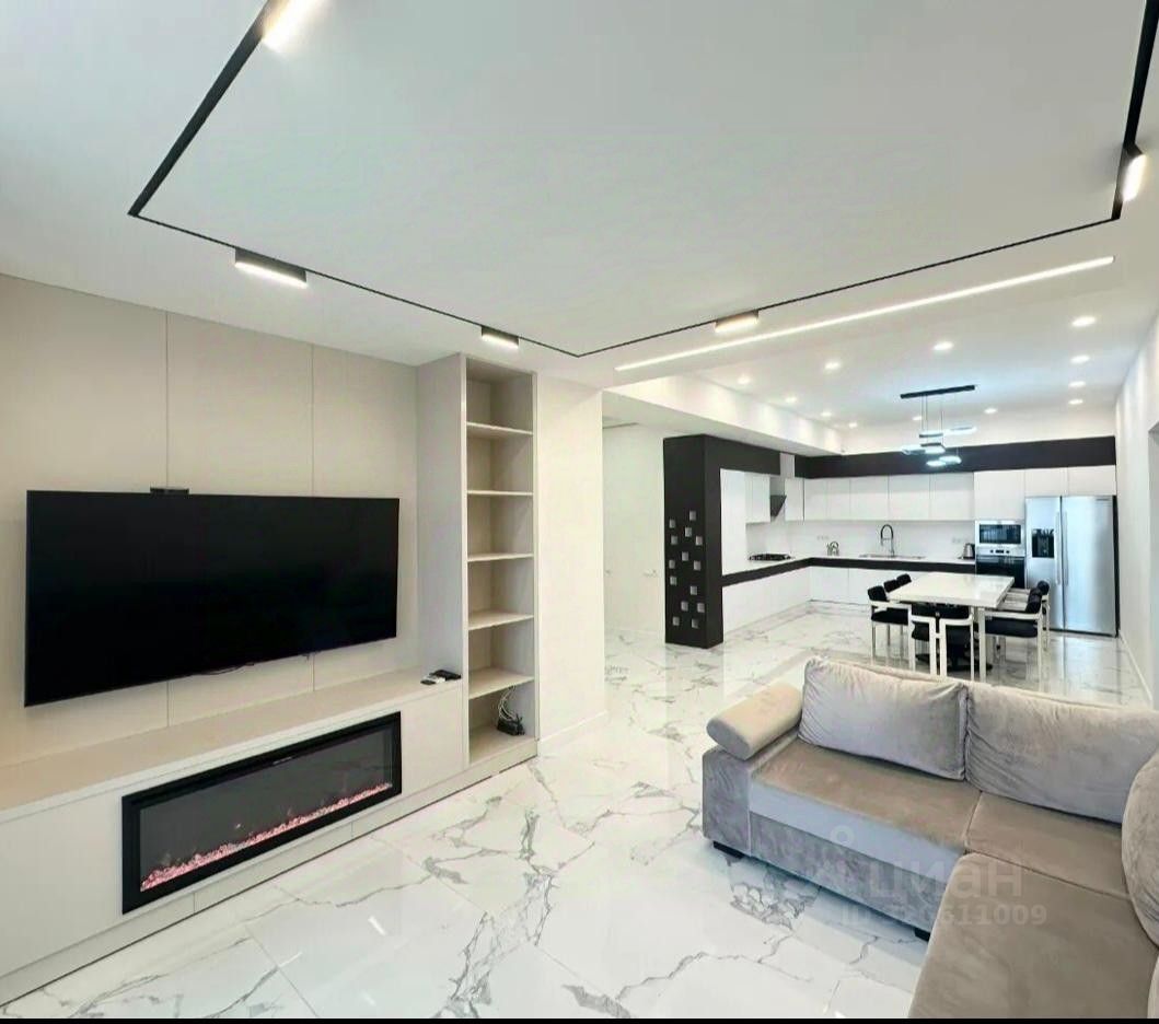С дорогущим ремонтом, мебелью и техникой. Планировка: кухня, гостиная-столовая, две спальни(в одной свой санузел), санузел общий и гардеробная комната. Техника абсолютно вся: Телевизор в гостиной, в спальнях, стиральная, сушильная и посудомоечная машины, кофемашина, робот пылесос, чайник, фен, утюг и так далее. Система умного дома. Вся инфраструктура благоустроенного района: В доме находятся продуктовый и хозяйственный магазины, аптека,
