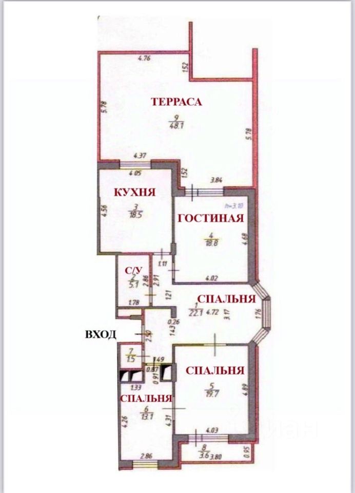 Параметры квартиры: Общая площадь по ЕГРН 98.8 кв.м, комнаты: 22,1+18,8+13,2+19,7, кухня: 18,5 кв.м., Уникальная квартира с очень интересной планировкой, собственной террасой 48кв.м. и балконом. 2 санузла, имеется гардеробная.