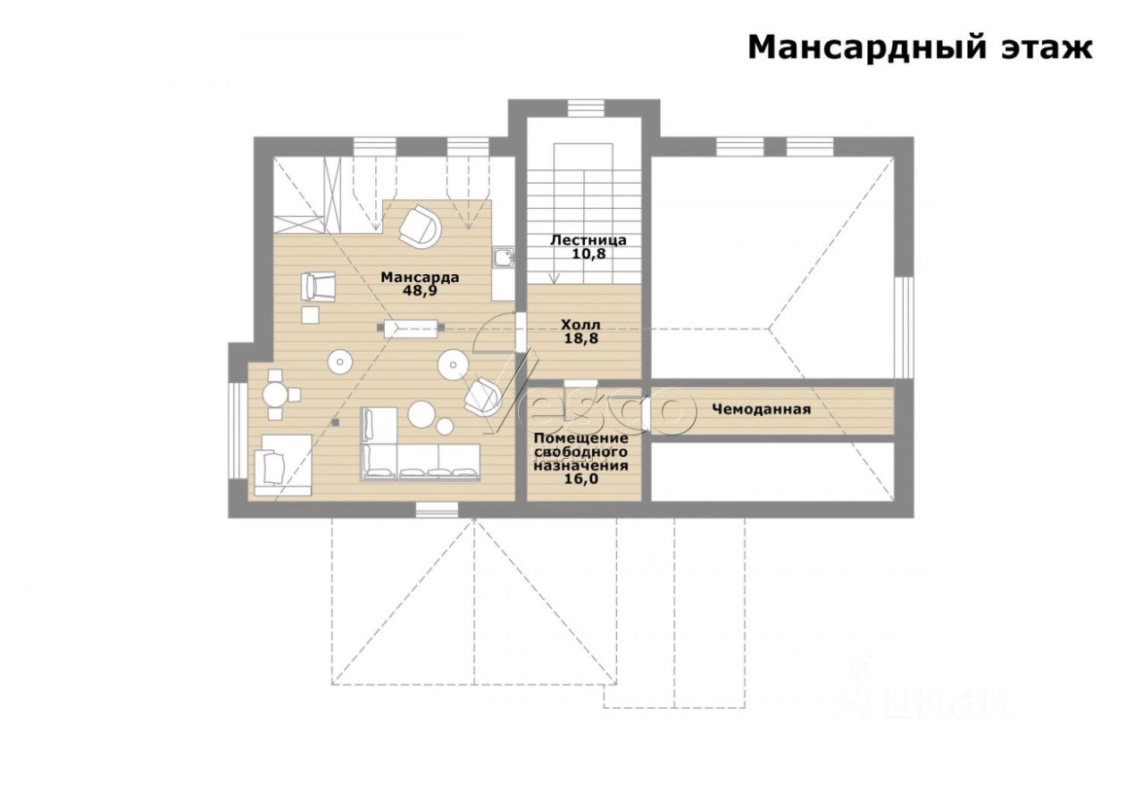 Мансарда: мансардное помещение (48,9), помещение свободного назначения (8,9), холл (3,8), чемоданная.