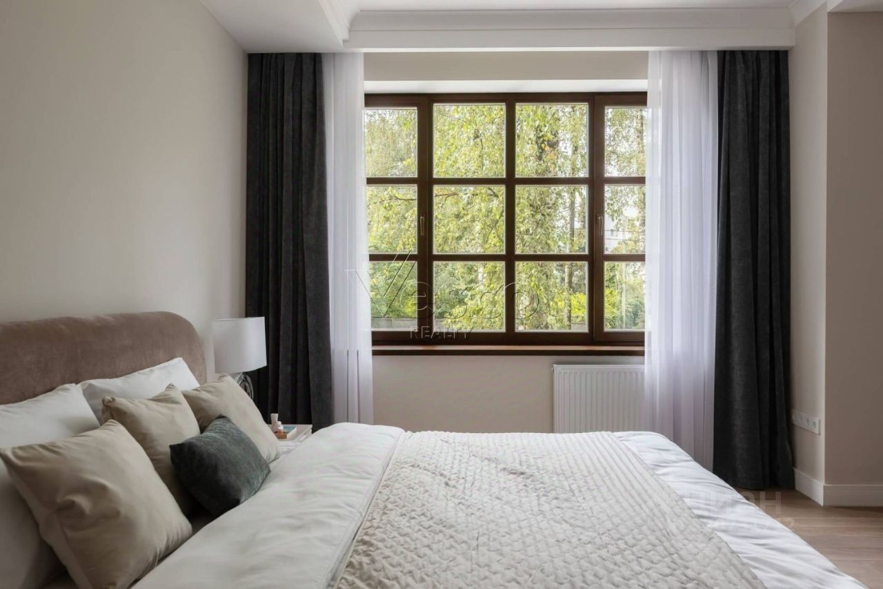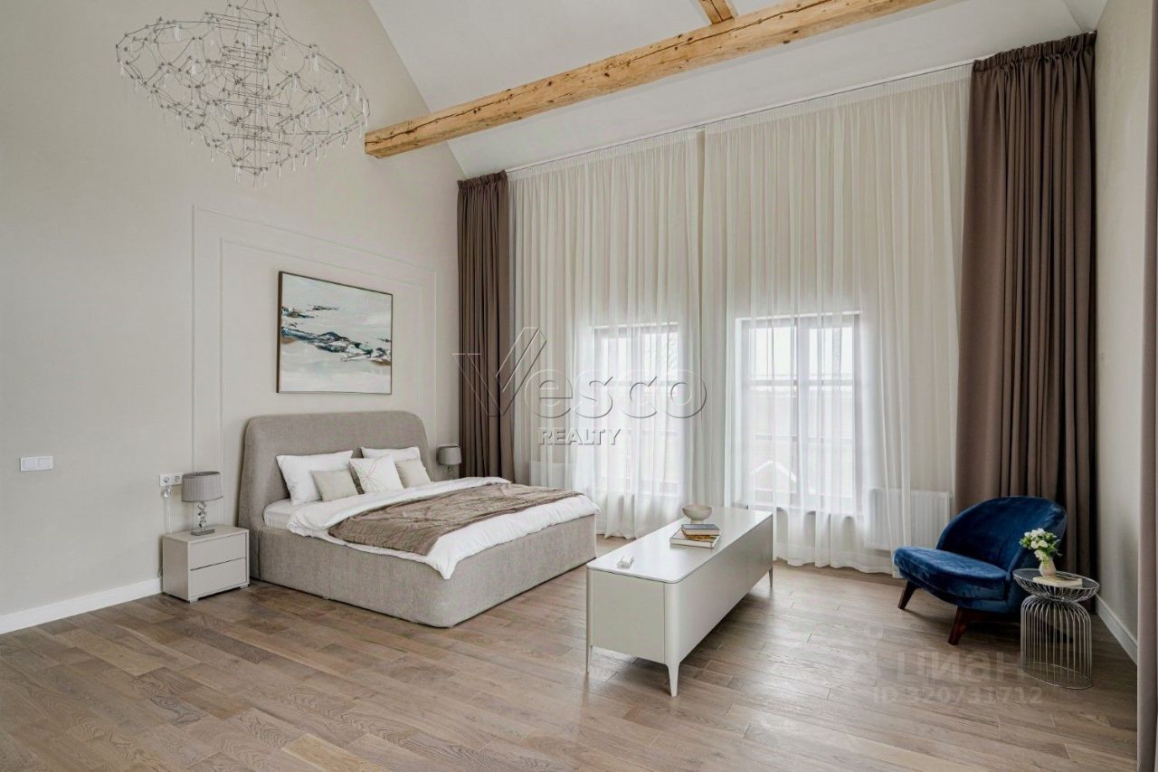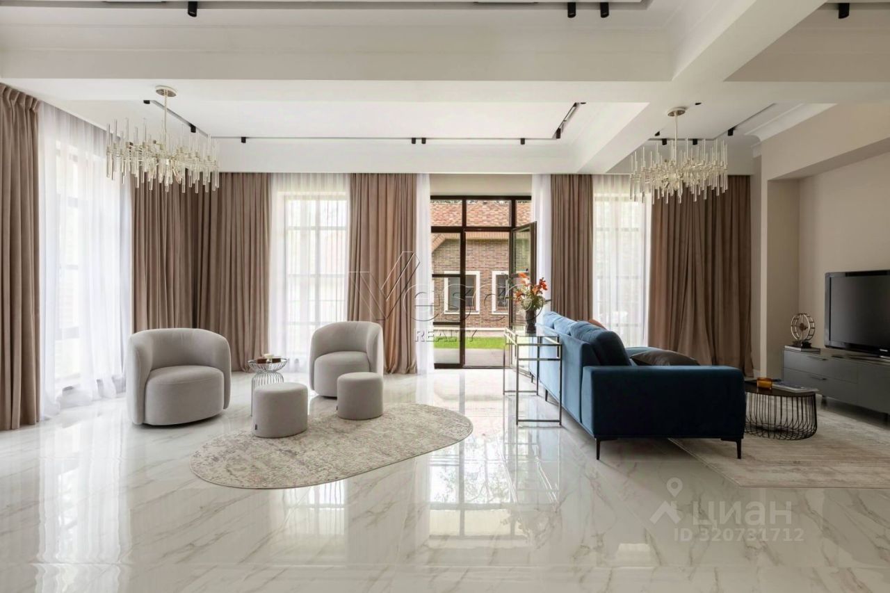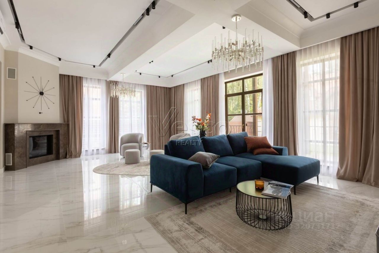В основном доме: 4 спальни, просторная гостиная с камином, облицованным мрамором и выходом на террасу, мастер-спальня со вторым светом с высотой потолков 5,5 м, кухня, столовая, кабинет, 3 санузла, постирочная, гардеробные, чемоданная комната.