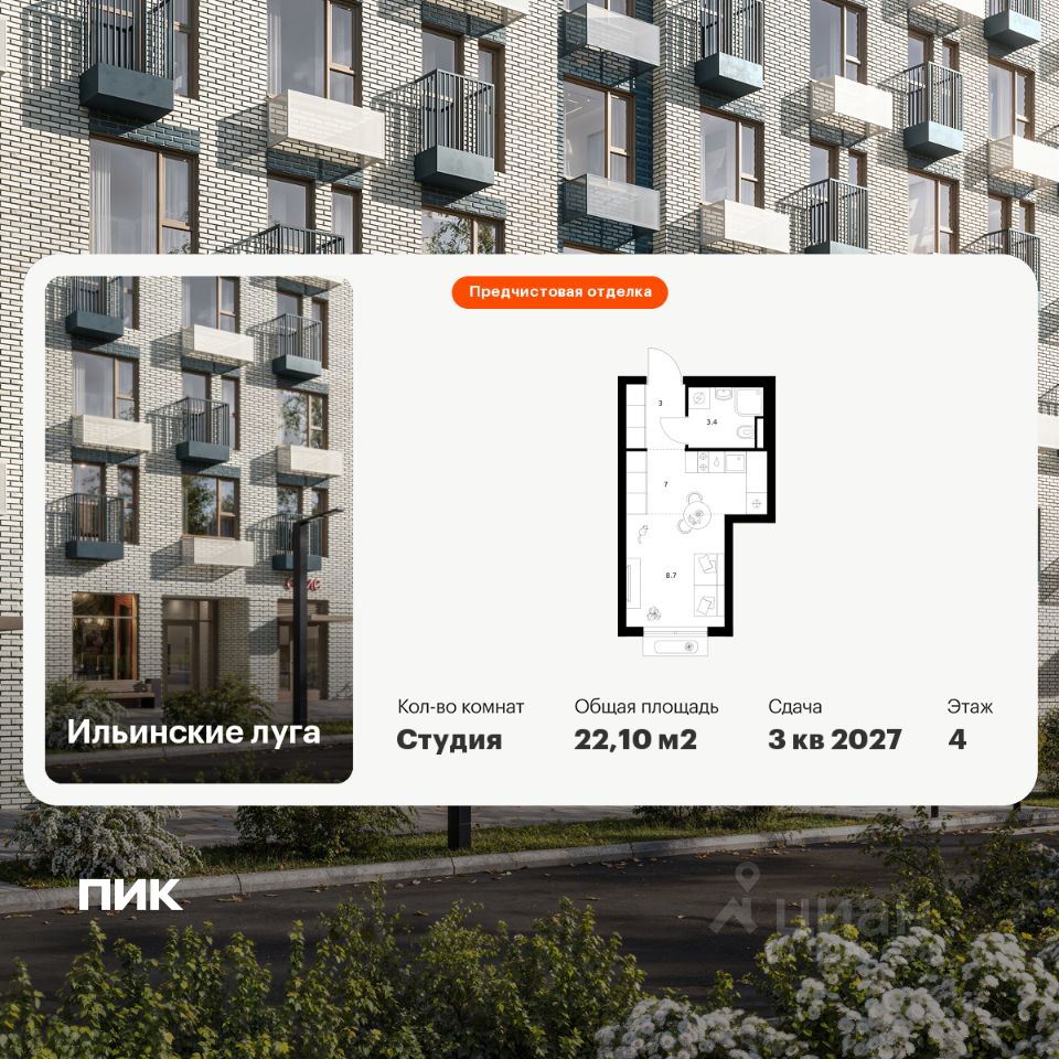 Продаётся квартира-студия площадью 22,1 кв.м на 4 этаже 9 этажного дома (Корпус 4.3, Секция 3) проекта ПИК Ильинские луга. Светлый просторный подъезд на уровне земли, функциональная планировка, большие окна, предчистовая отделка.