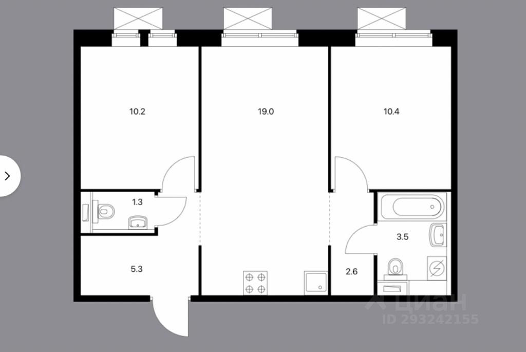 Кухня-гостинная, две спальни (распашонка), два санузла.