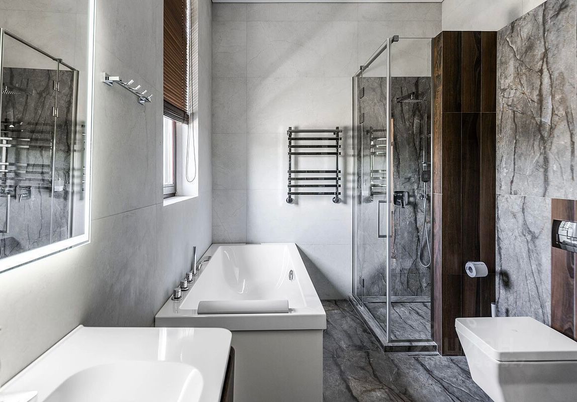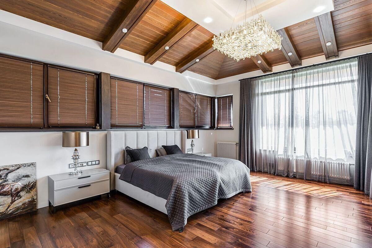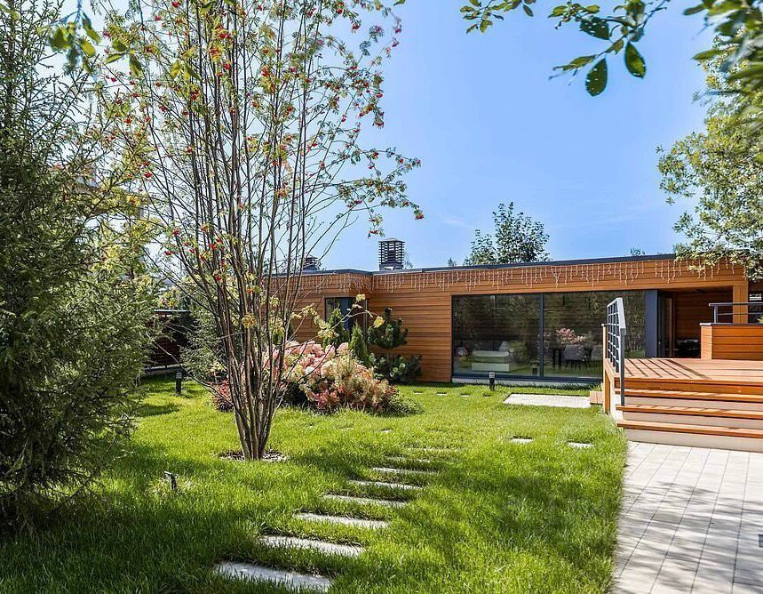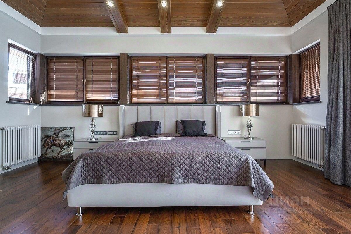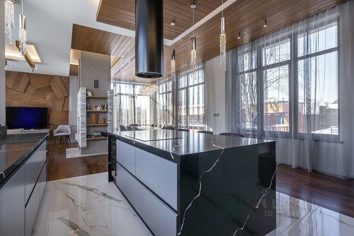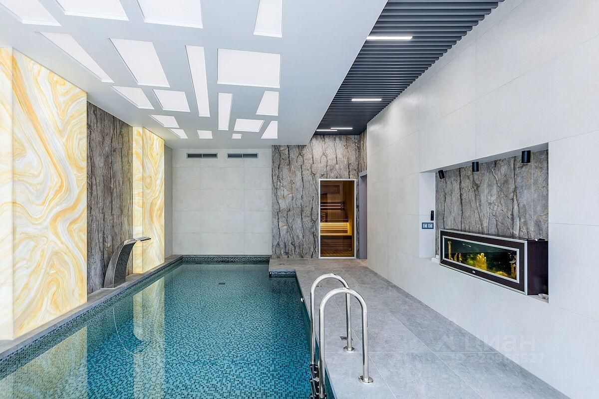 Состав помещений: 1-й этаж: кухня-гостиная с двусторонним камином и панорамными остеклением, бассейн с противотоком 7 м, сауна, терраса открытая, 2 санузла и гардеробная, постирочная, гардеробная, гараж на 2 авто. 2-й этаж: 3 спальни и кабинет (спальня) со своими гардеробными и санузлами, спальня с отдельной лестницей и своей кухней (можно использовать как блок для персонала или как гостевой блок).