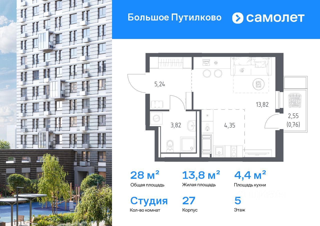 Предлагается квартира студия комфорт-класса 27,99 кв.м в корпусе 27 на 5 этаже, в ЖК ''Большое Путилково'' Квартира с чистовой отделкой. Доступность дополнительных опций уточняйте у застройщика.