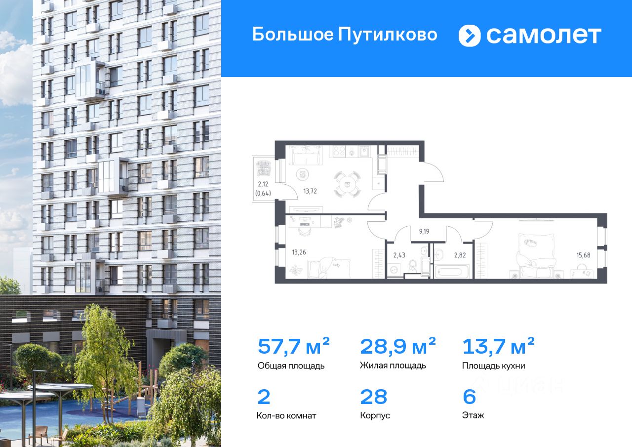 Предлагается 2-комнатная квартира комфорт-класса 57,74 кв.м в корпусе 28 на 6 этаже, в ЖК ''Большое Путилково'' Квартира с чистовой отделкой. Доступность дополнительных опций уточняйте у застройщика.