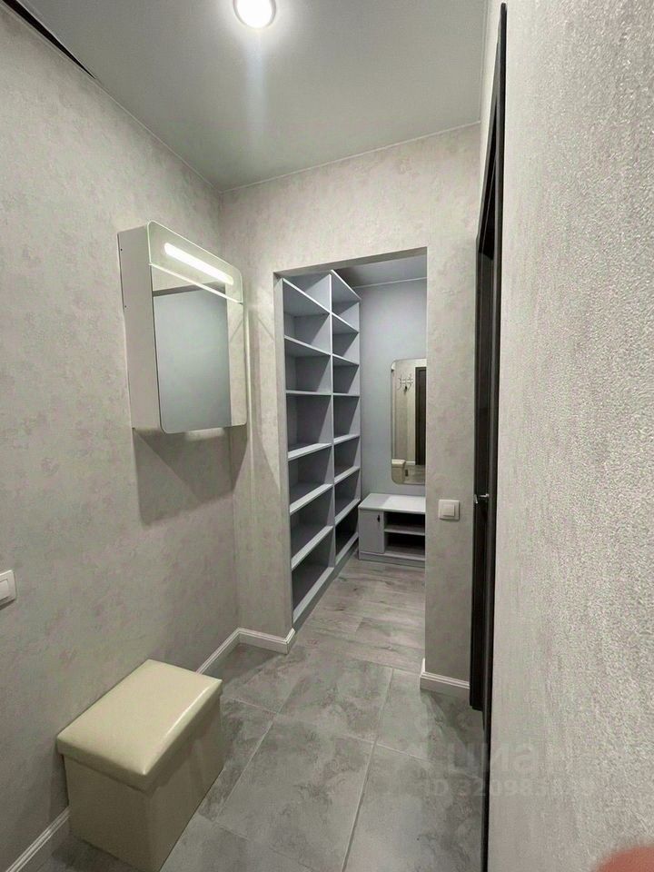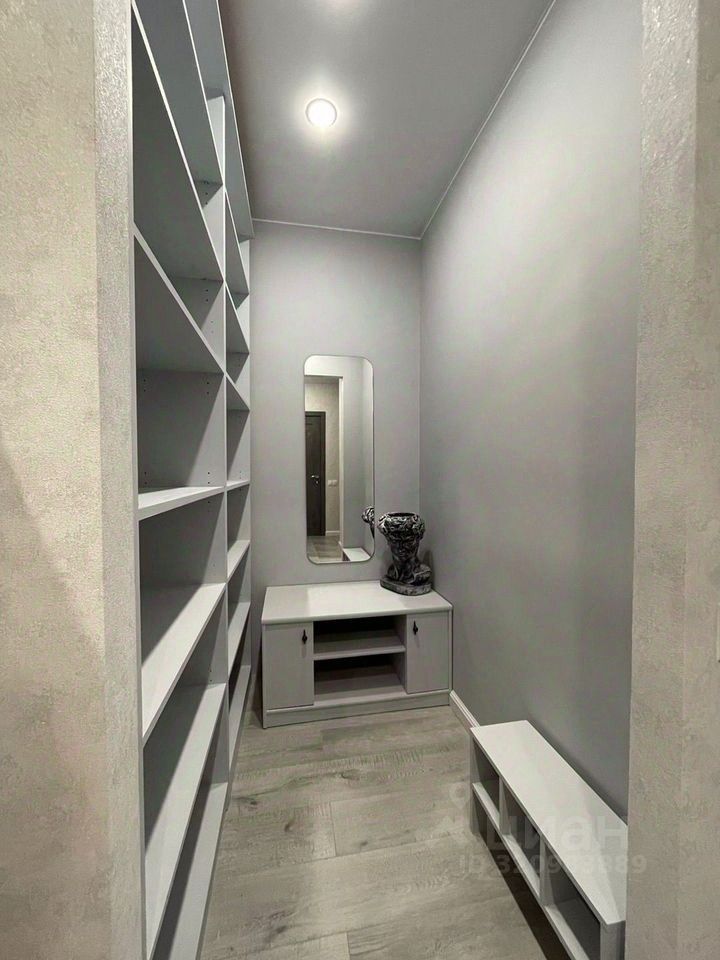 Оснащённая гардеробная с большим зеркалом с подсветкой.