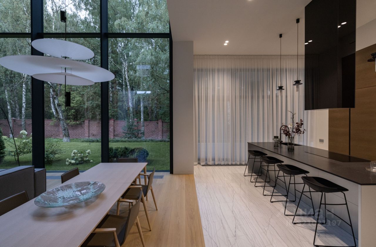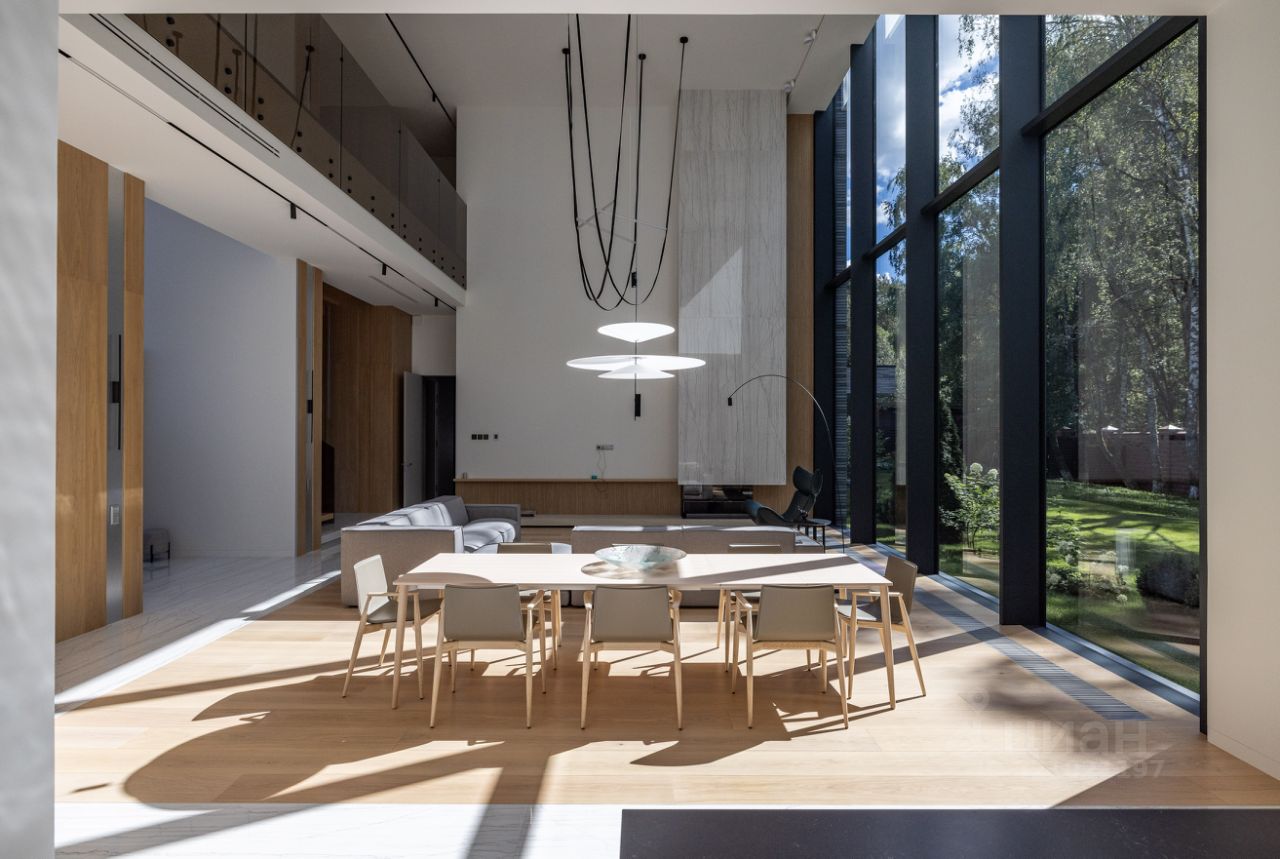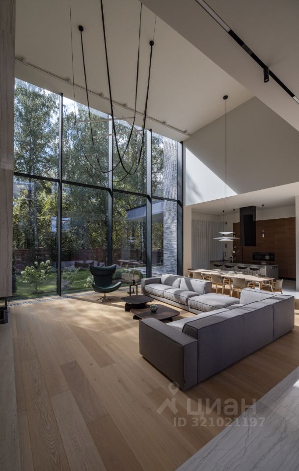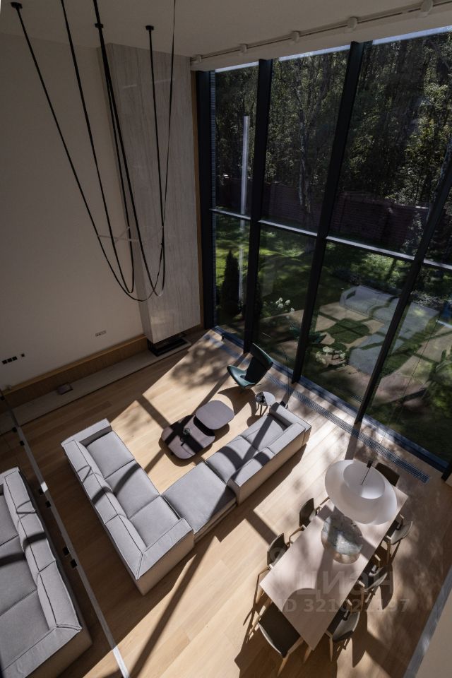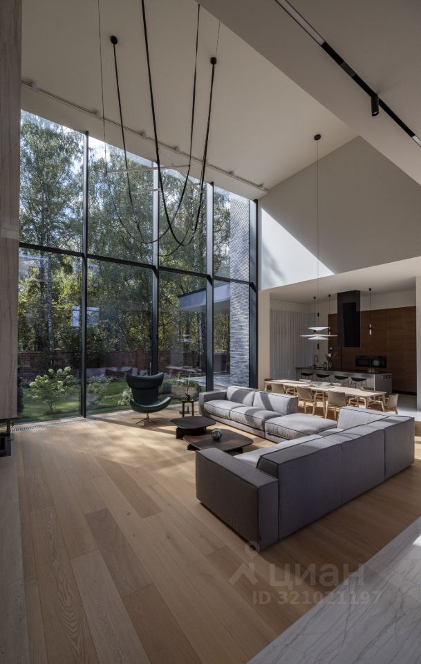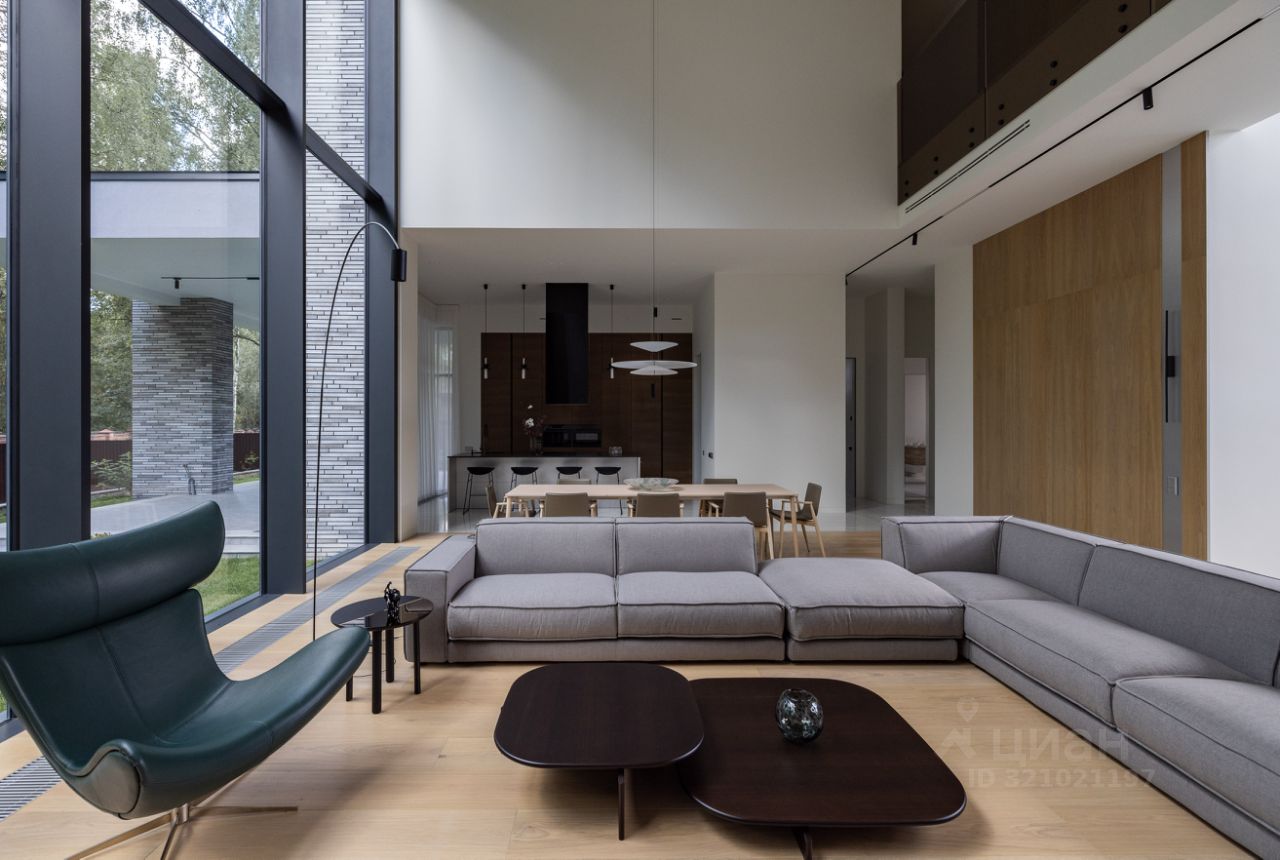 Пространство с вторым светом, панорамное остекление, открывающее виды на лес, и впечатляющие потолки высотой до 8 метров.