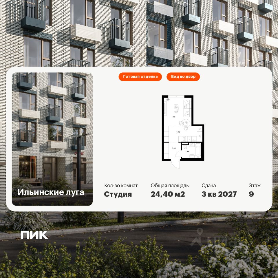 Продаётся квартира-студия площадью 24,4 кв.м на 9 этаже 9 этажного дома (Корпус 4.1, Секция 2) проекта ПИК Ильинские луга. Светлый просторный подъезд на уровне земли, функциональная планировка, большие окна, c отделкой.