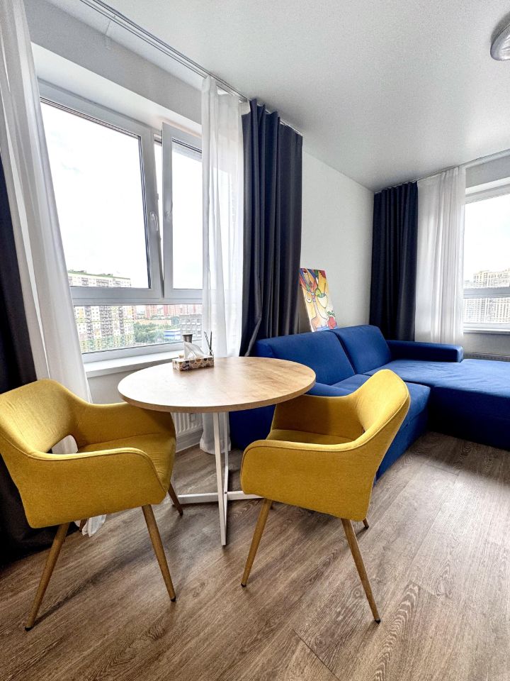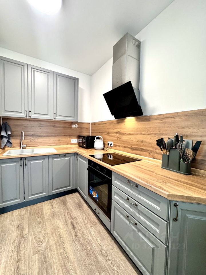 В квартире новый ремонт, встроенная кухня со всей бытовой техникой , обеденная группа, большой угловой диван, тумба с телевизором.