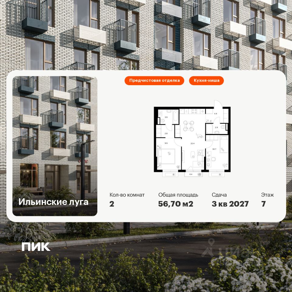 Продаётся 2-комн. квартира площадью 56,7 кв.м на 7 этаже 9 этажного дома (Корпус 4.3, Секция 4) проекта ПИК Ильинские луга. Светлый просторный подъезд на уровне земли, функциональная планировка, большие окна, предчистовая отделка.