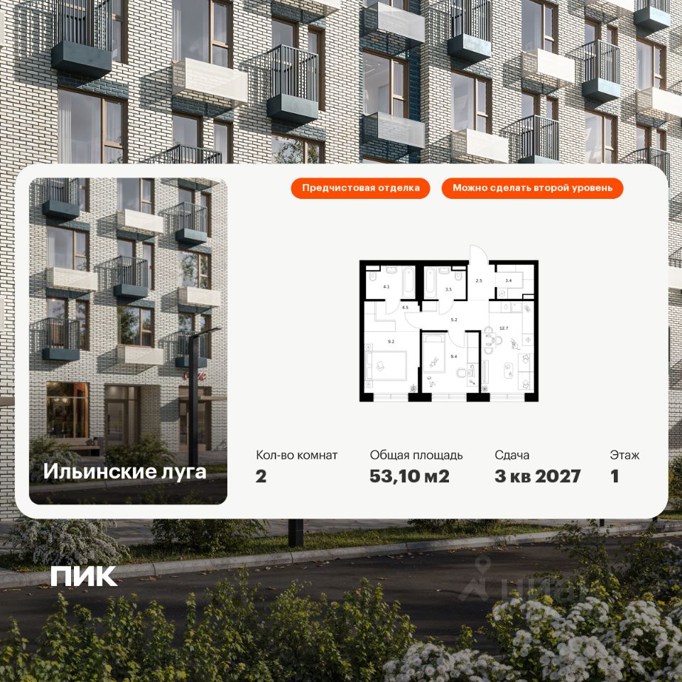 Продаётся 2-комн. квартира площадью 53,1 кв.м на 1 этаже 9 этажного дома (Корпус 4.3, Секция 2) проекта ПИК Ильинские луга. Светлый просторный подъезд на уровне земли, функциональная планировка, большие окна, предчистовая отделка.