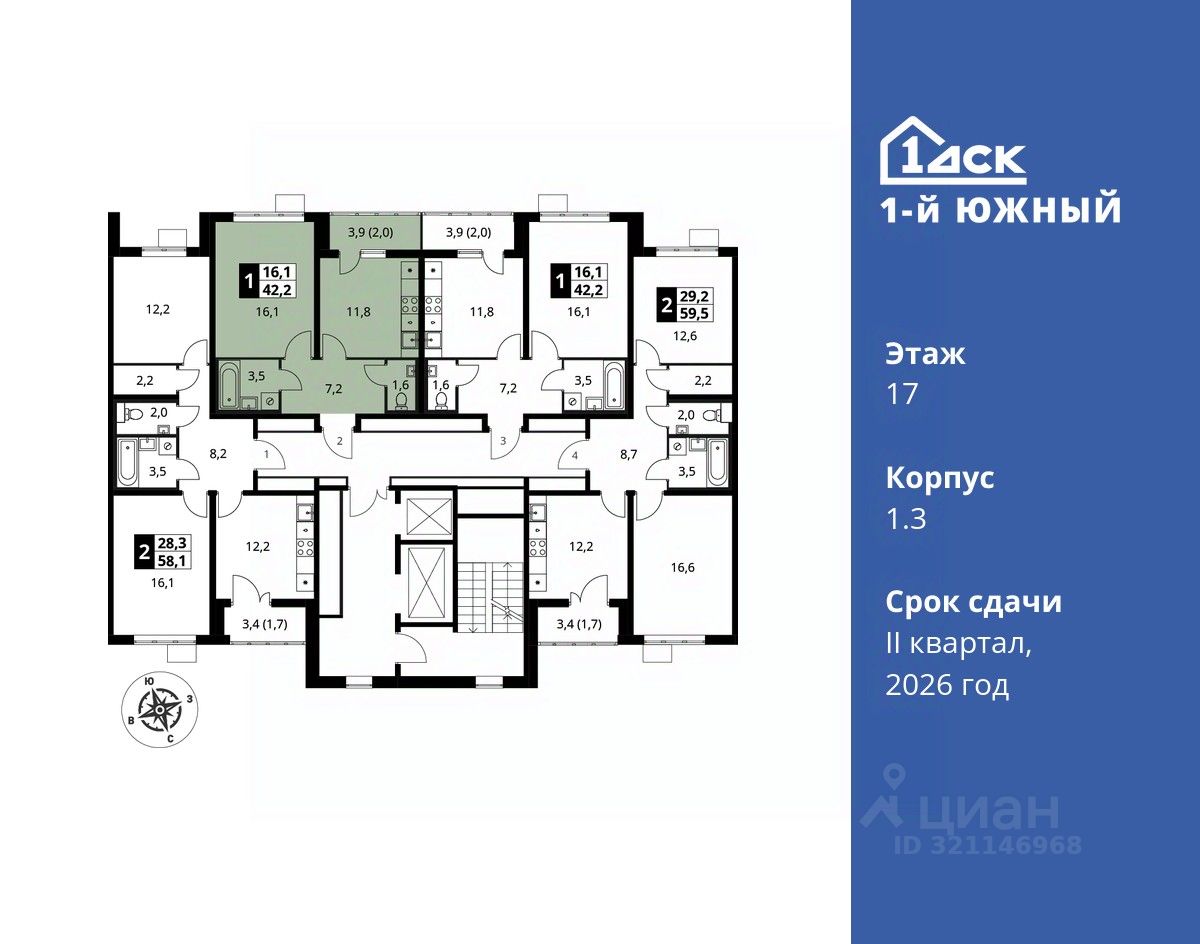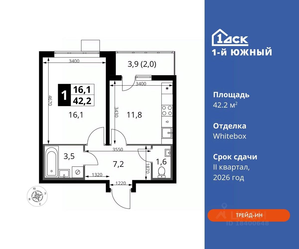 продам 1-к, Первый Южный ЖК, 1.39 938 944 ₽