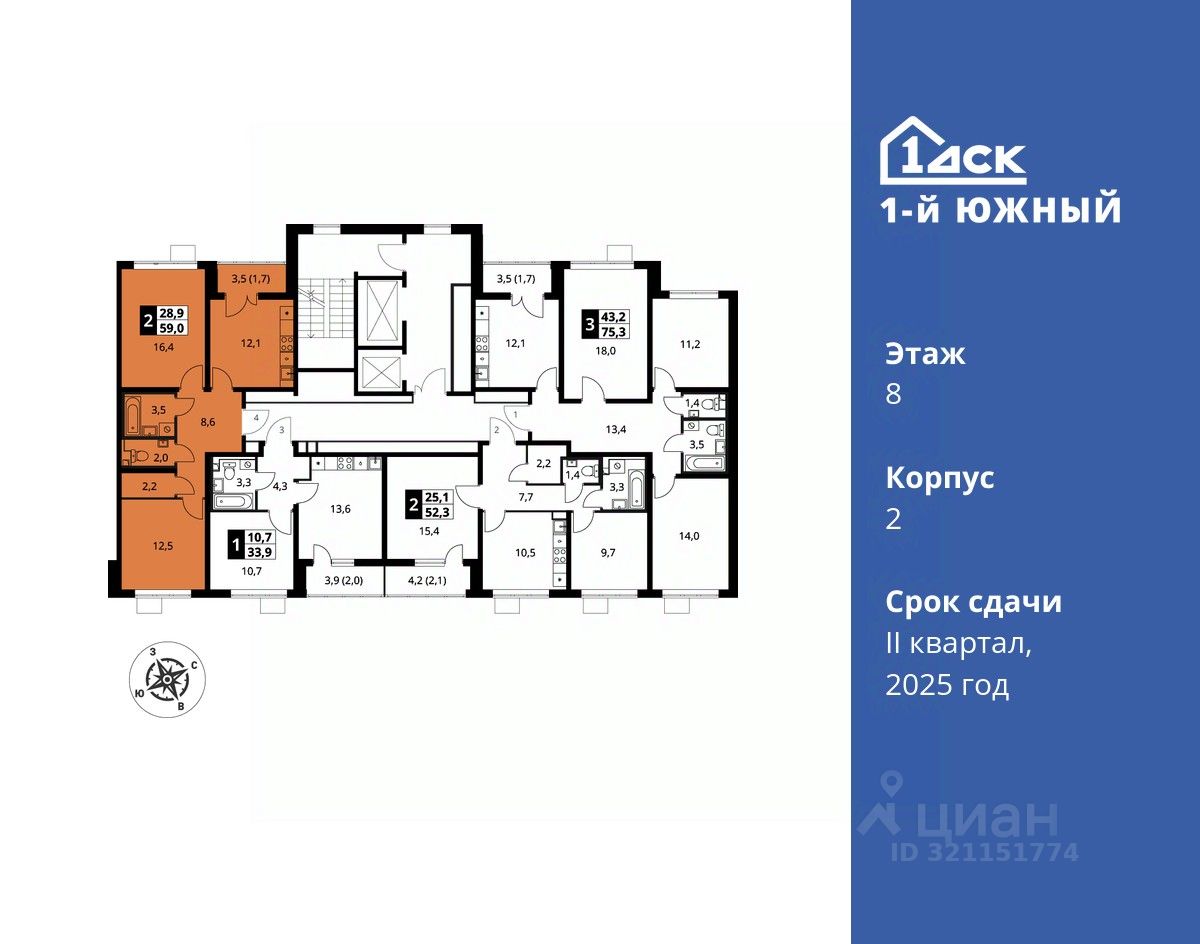 Максимальные скидки при 100% оплате. Trade-in вместо первоначального взноса - выгодно обменяйте вашу квартиру на новую! Корпус сдан! Прямая продажа от застройщика! Жилой Комплекс класса Комфорт плюс. Продаётся 2-к квартира номер 258 в сданном корпусе общей площадью 59 кв.м на 8-м этаже 25 этажного дома.