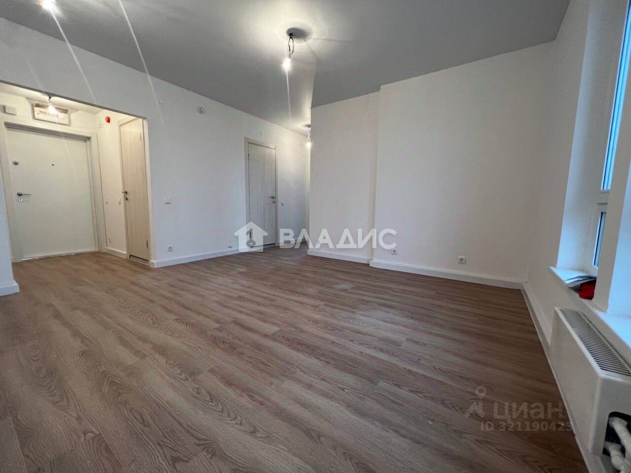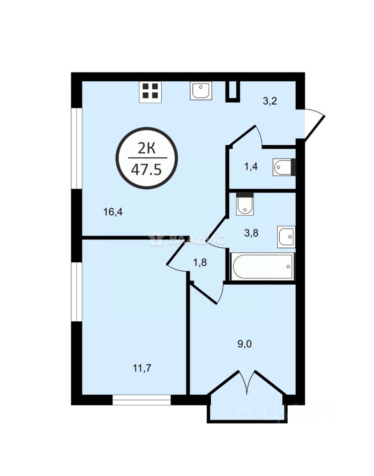 Квартира расположена на 4 этаже 9-этажного монолитного дома. Общая площадь — 47,5 кв. м, из которых 20,7 кв. м — жилая площадь, 16,4 кв. м — кухня. Комнаты изолированы, их площадь — 9 и 11,7 кв. м. Окна выходят во двор.