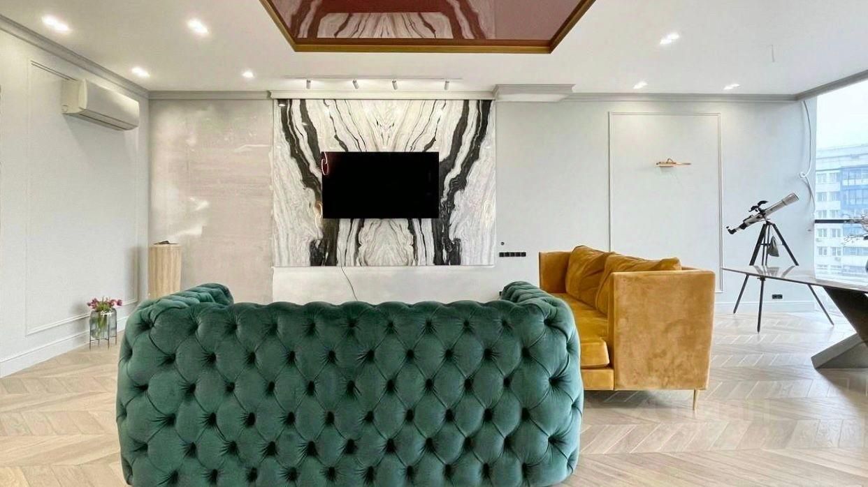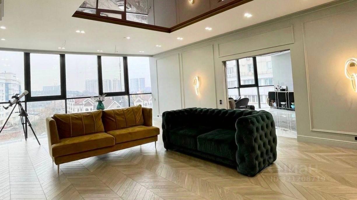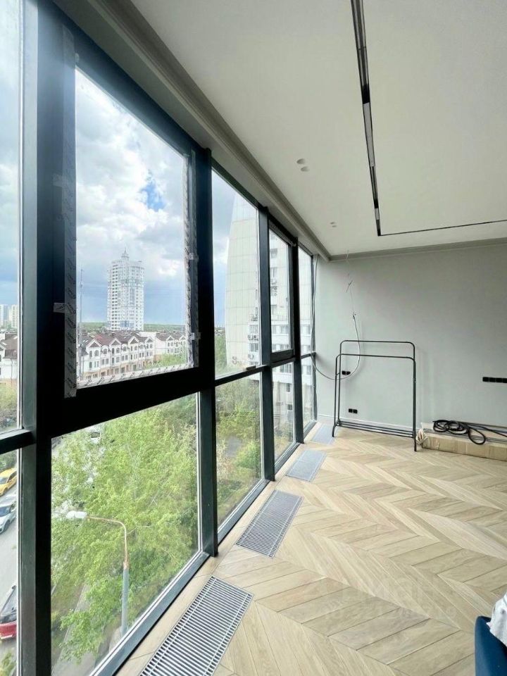 РЕМОНТ: Выполнен дорогостоящий дизайнерский ремонт. Стоят качественные стеклопакеты. Полы - паркет из массива дуба. В прихожей, ванной, санузле, кухне уложен итальянский керамогранит форматом. Пол с подогревом. За счет высоких потолков сделаны подвесные, многоуровневые потолки со светильниками ''MAYTONI''. В ванной комнате и санузле установлены чугунная ванна и унитазы ''Jacob Delafon''. В зале на стену смонтирован слеб из мрамора в виде ''бабочки''. Весь витражный профиль перекрашен в темно-серый свет. Установлены 4 кондиционера.
