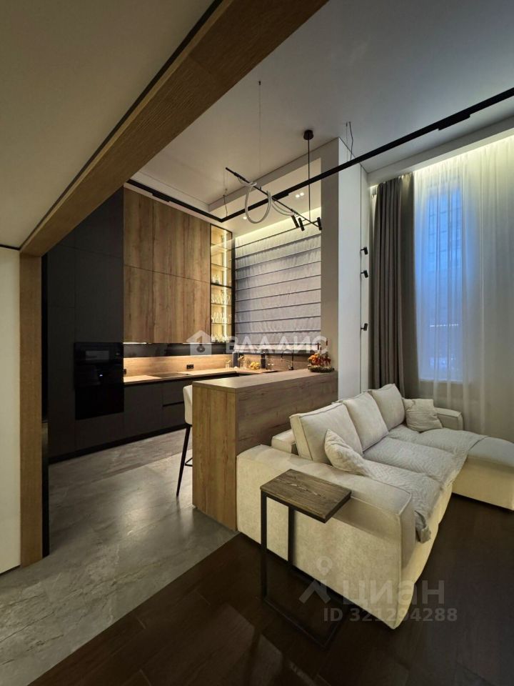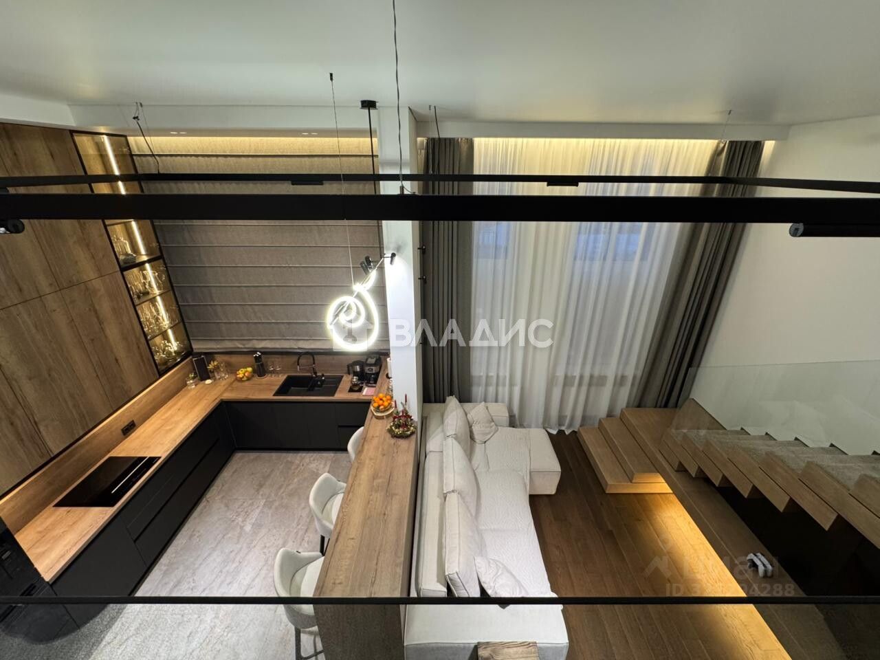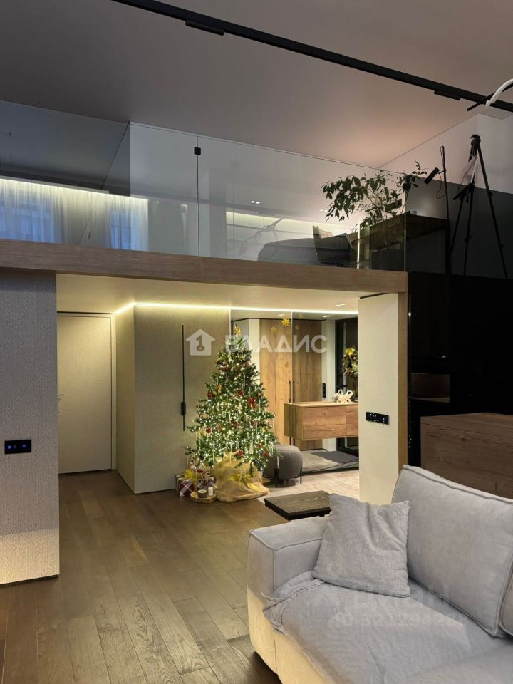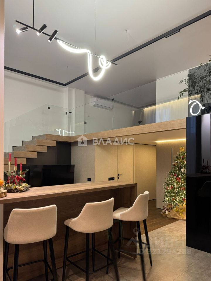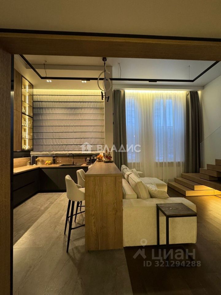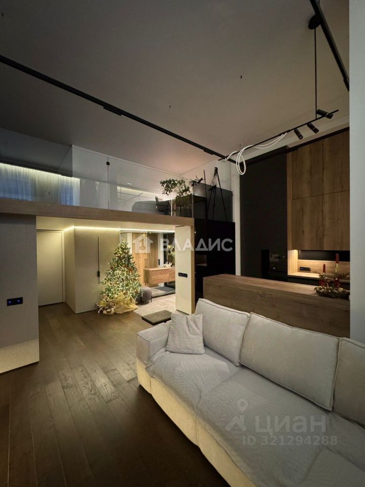 Квартира расположена на первом этаже 9-этажного монолитного дома, построенного в 2021 году. Общая площадь составляет 84 кв. м, кухня — 12,6 кв. м. Высота потолков 4,2 м создаёт ощущение простора и свободы. Окна выходят на улицу.