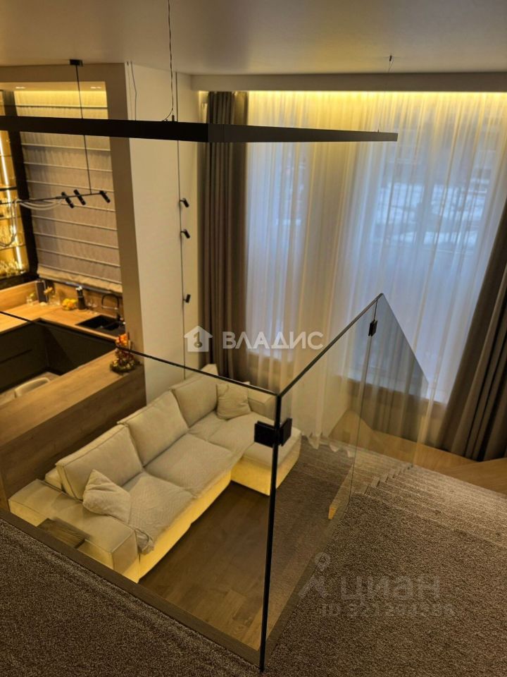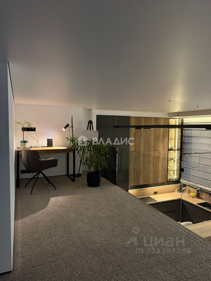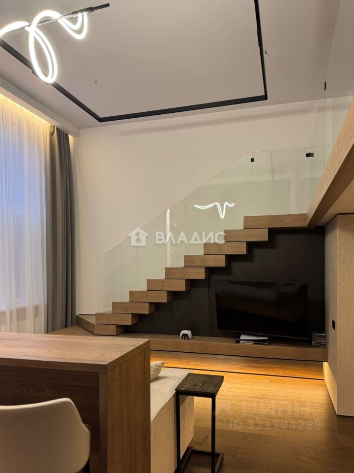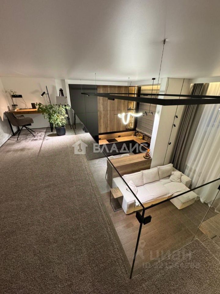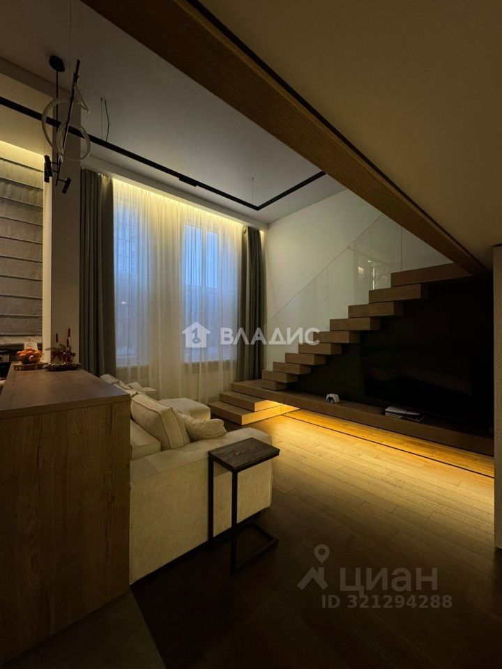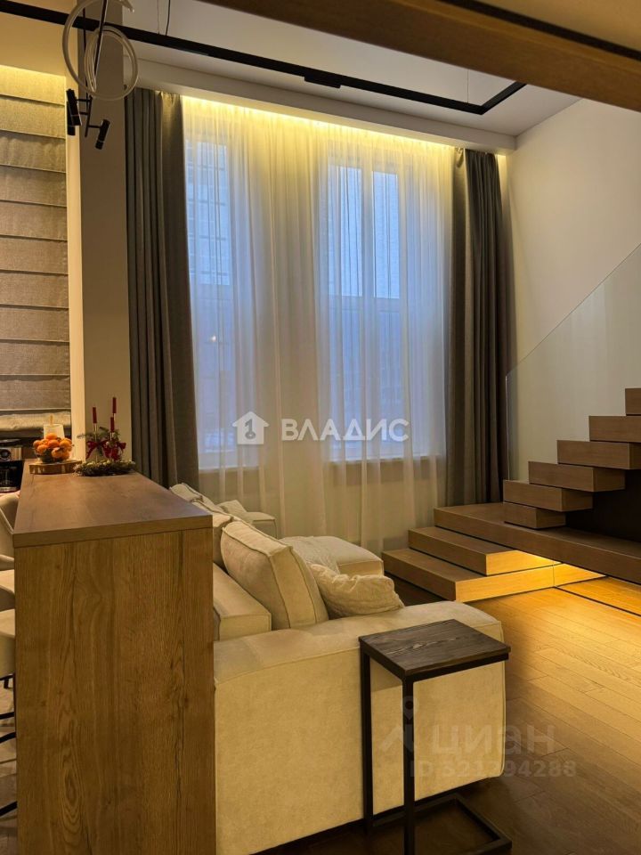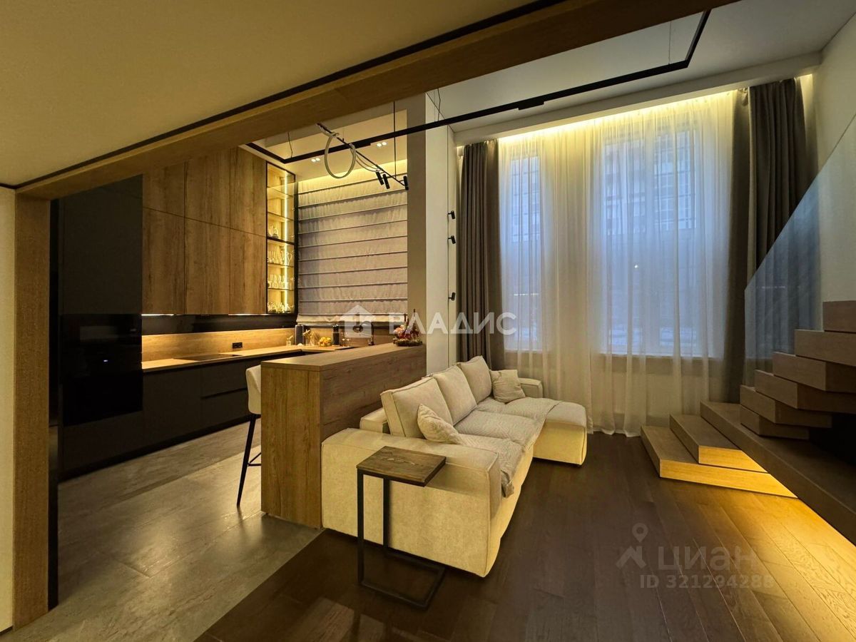 Квартира расположена на первом этаже 9-этажного монолитного дома, построенного в 2021 году. Общая площадь составляет 84 кв. м, кухня — 12,6 кв. м. Высота потолков 4,2 м создаёт ощущение простора и свободы. Окна выходят на улицу.