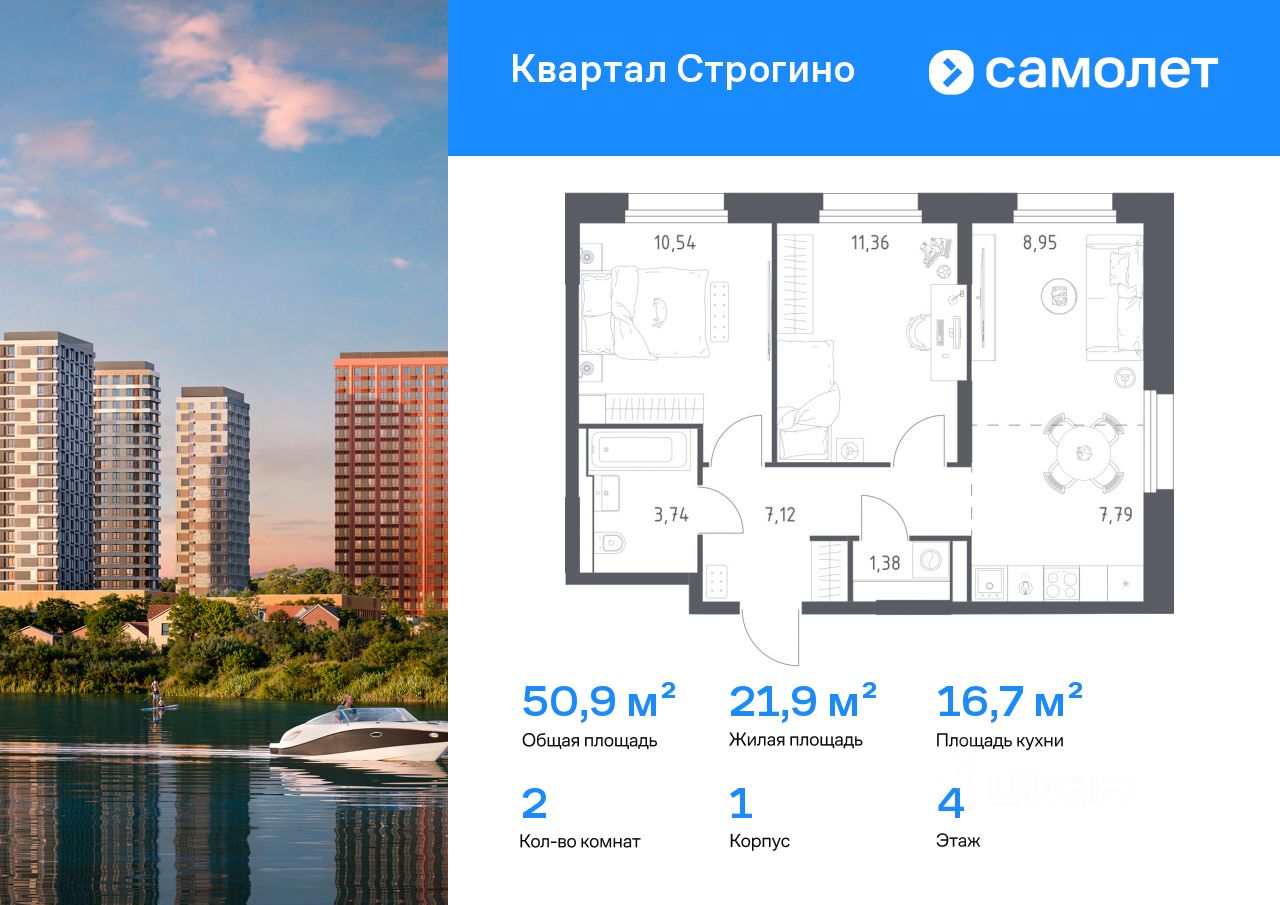 Предлагается 2-комнатная квартира комфорт-класса 50,88 кв.м в корпусе 1 на 4 этаже, в ЖК ''Квартал Строгино'' Квартира с чистовой отделкой. Доступность дополнительных опций уточняйте у застройщика.