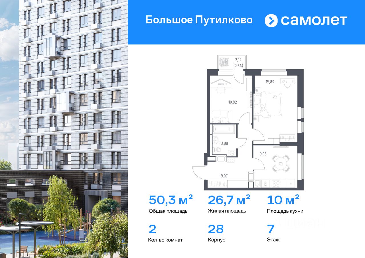 Предлагается 2-комнатная квартира комфорт-класса 50,28 кв.м в корпусе 28 на 7 этаже, в ЖК ''Большое Путилково'' Квартира с чистовой отделкой. Доступность дополнительных опций уточняйте у застройщика.