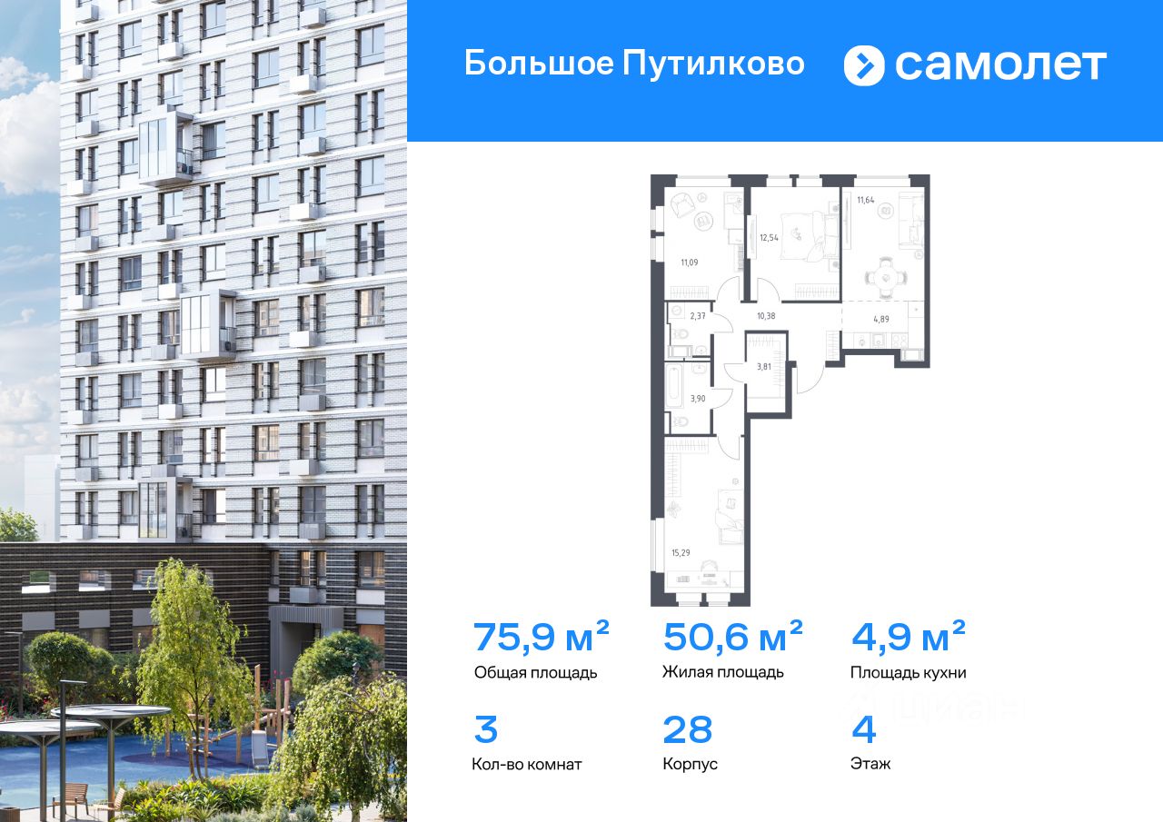 Предлагается 3-комнатная квартира комфорт-класса 75,91 кв.м в корпусе 28 на 4 этаже, в ЖК ''Большое Путилково'' Квартира с чистовой отделкой. Доступность дополнительных опций уточняйте у застройщика.