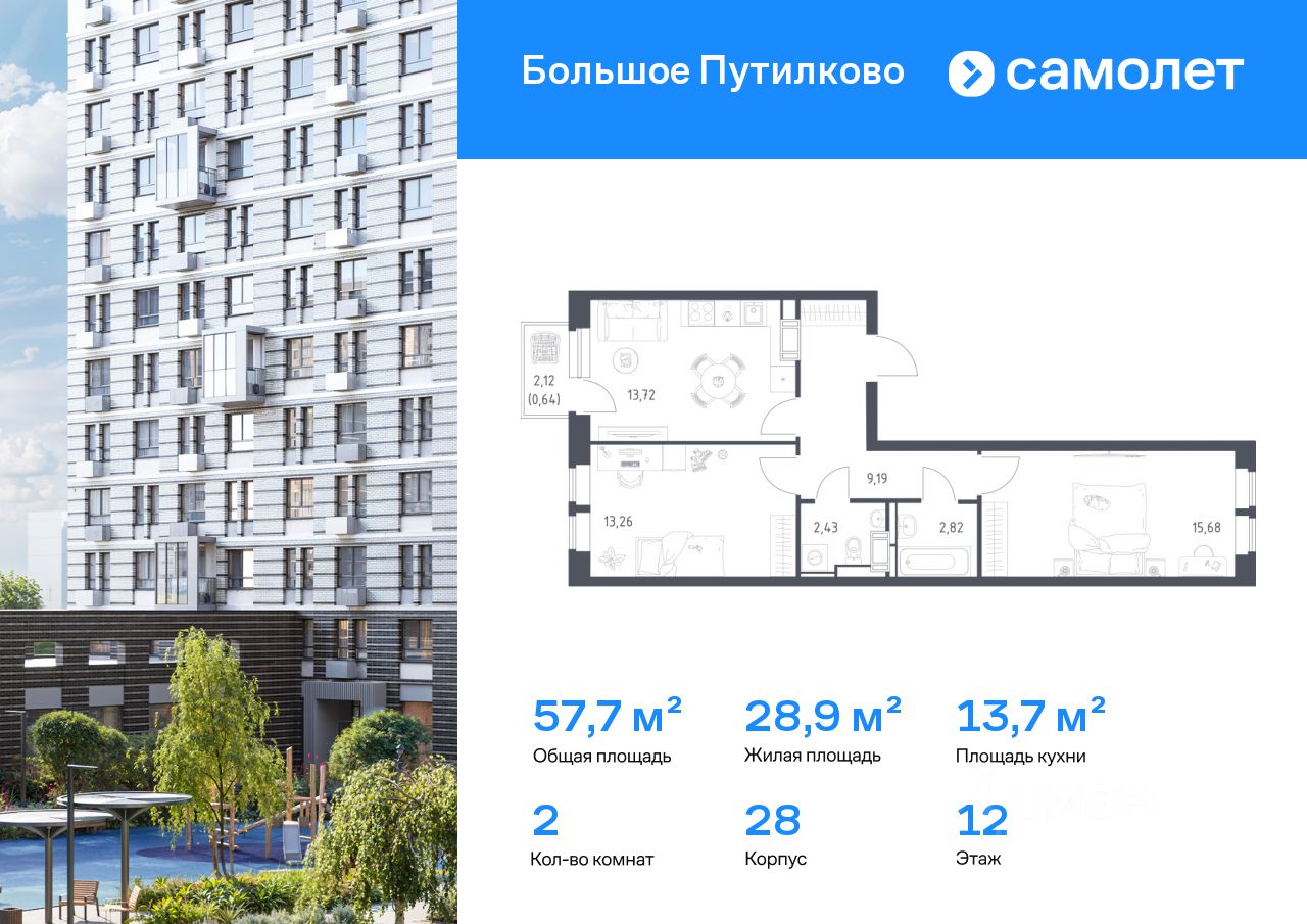 Строим кварталы для жизни с заботой о будущем. Предлагается 2-комнатная квартира комфорт-класса 57,74 кв.м в корпусе 28 на 12 этаже, в ЖК ''Большое Путилково'' Квартира с чистовой отделкой. Доступность дополнительных опций уточняйте у застройщика.