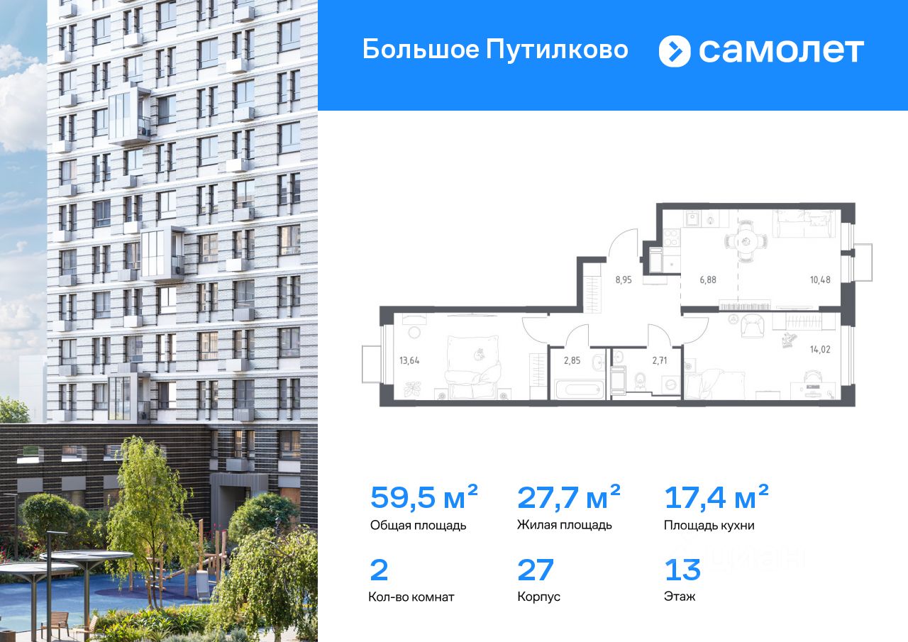 Строим кварталы для жизни с заботой о будущем. Предлагается 2-комнатная квартира комфорт-класса 59,53 кв.м в корпусе 27 на 13 этаже, в ЖК ''Большое Путилково'' Квартира с чистовой отделкой. Доступность дополнительных опций уточняйте у застройщика.