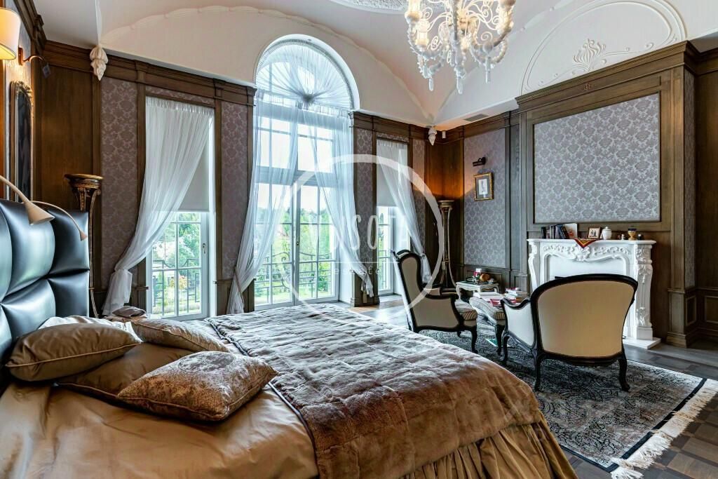 Состав помещений: Цоколь: тренажерный зал, хаммам, массажный кабинет, душевая, с/у, джакузи, постирочная, подземный переход в дом для персонала. 1-й этаж: прихожая, гардеробная, большая гостиная с камином и выходом на террасу, столовая, кухня, спальня с с/у, кинотеатр, кабинет, гостевой с/у, зимний сад, гараж на 3 м/м. 2-й этаж: холл, 2 спальни с ванными комнатами, хозяйский блок: спальня с ванной комнатой, с двумя гардеробными и камином, библиотека, спальня с ванной комнатой и гардеробной