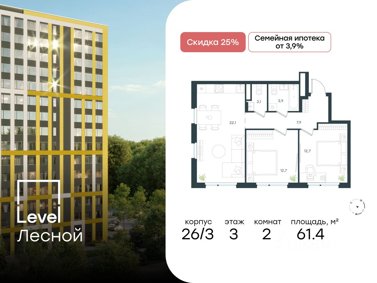 В районе, утопающем в густой зелени лесов, многочисленных парков и скверов, продаётся 2-комнатная квартира площадью 61.40 кв.м без отделки. Квартира расположена на 3 этаже в жилом комплексе комфорт-класса Level Лесной (компания Level Group/Левел групп).