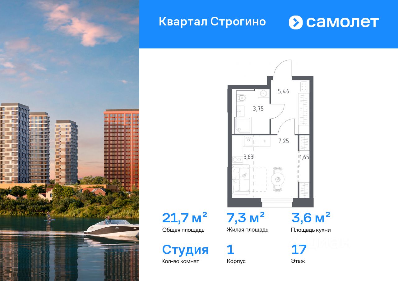 Предлагается квартира студия комфорт-класса 21,74 кв.м в корпусе 1 на 17 этаже, в ЖК ''Квартал Строгино'' Квартира с чистовой отделкой. Доступность дополнительных опций уточняйте у застройщика.