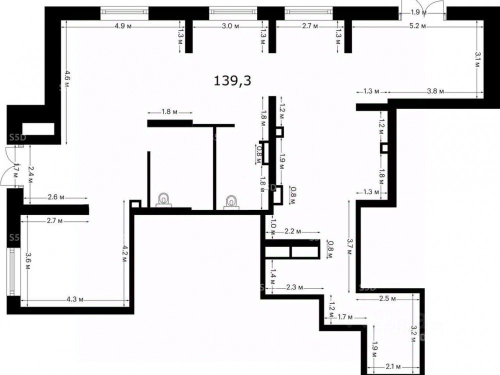 Технические параметры: Первый этаж с витринными окнами 24-ти этажного жилого дома, площадью 139.3 м2. Два отдельный входа, кабинетная планировка. Высота потолков 5 м, количество электроэнергии 28 кВт. Состояния помещения - бетон. Вытяжка общедомовая.