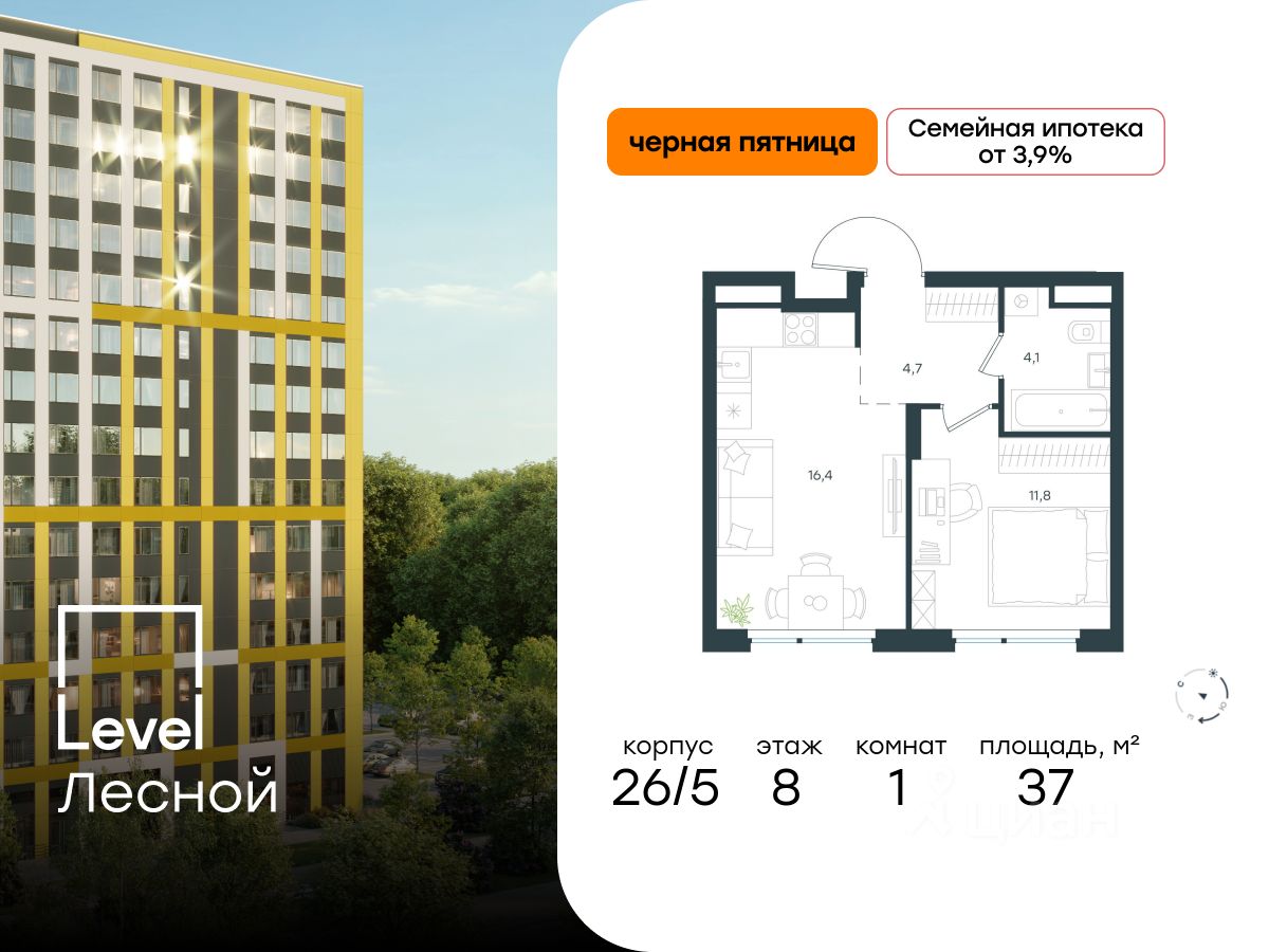 В районе, утопающем в густой зелени лесов, многочисленных парков и скверов, продаётся 1-комнатная квартира площадью 37.00 кв.м с отделкой white box. Квартира расположена на 8 этаже в жилом комплексе комфорт-класса Level Лесной (компания Level Group/Левел групп).
