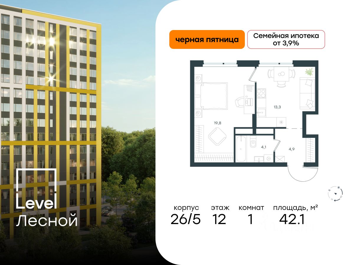 В районе, утопающем в густой зелени лесов, многочисленных парков и скверов, продаётся 1-комнатная квартира площадью 42.10 кв.м с отделкой white box. Квартира расположена на 12 этаже в жилом комплексе комфорт-класса Level Лесной (компания Level Group/Левел групп).