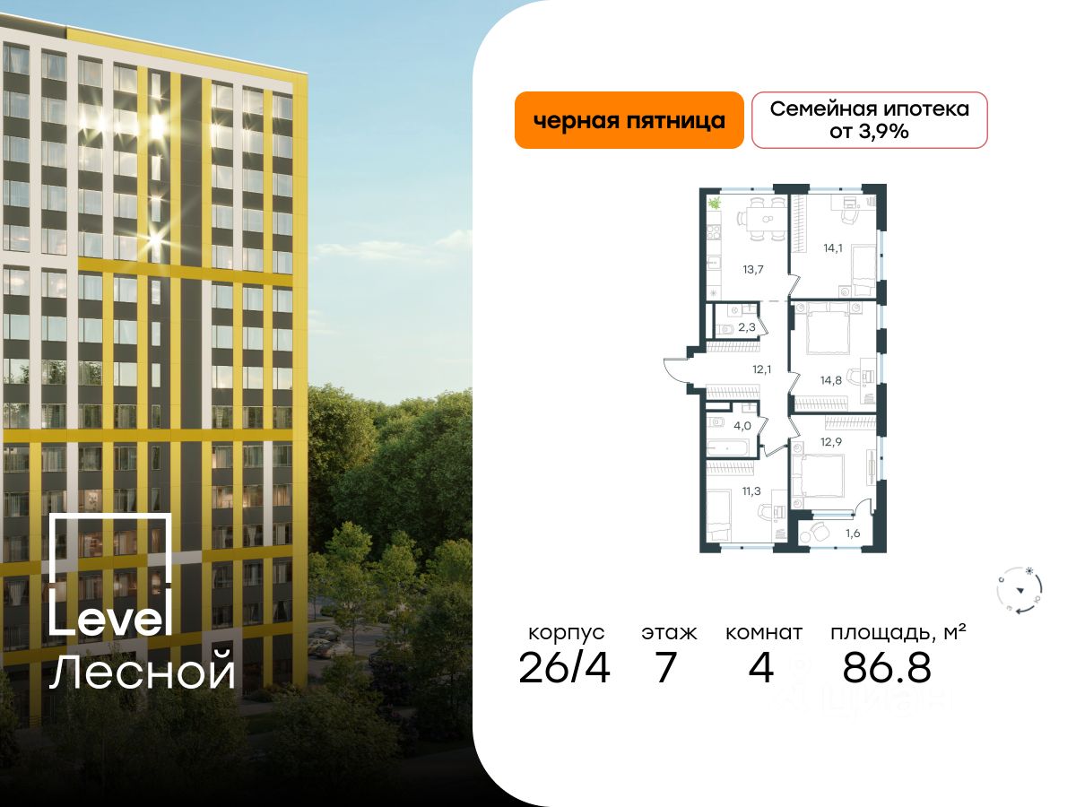 В районе, утопающем в густой зелени лесов, многочисленных парков и скверов, продаётся 4-комнатная квартира площадью 86.80 кв.м с отделкой white box. Квартира расположена на 7 этаже в жилом комплексе комфорт-класса Level Лесной (компания Level Group/Левел групп).