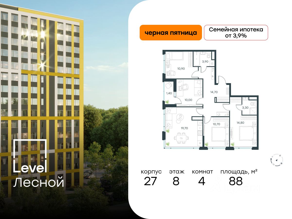 В районе, утопающем в густой зелени лесов, многочисленных парков и скверов, продаётся 4-комнатная квартира площадью 88.00 кв.м с отделкой white box. Квартира расположена на 8 этаже в жилом комплексе комфорт-класса Level Лесной (компания Level Group/Левел групп).