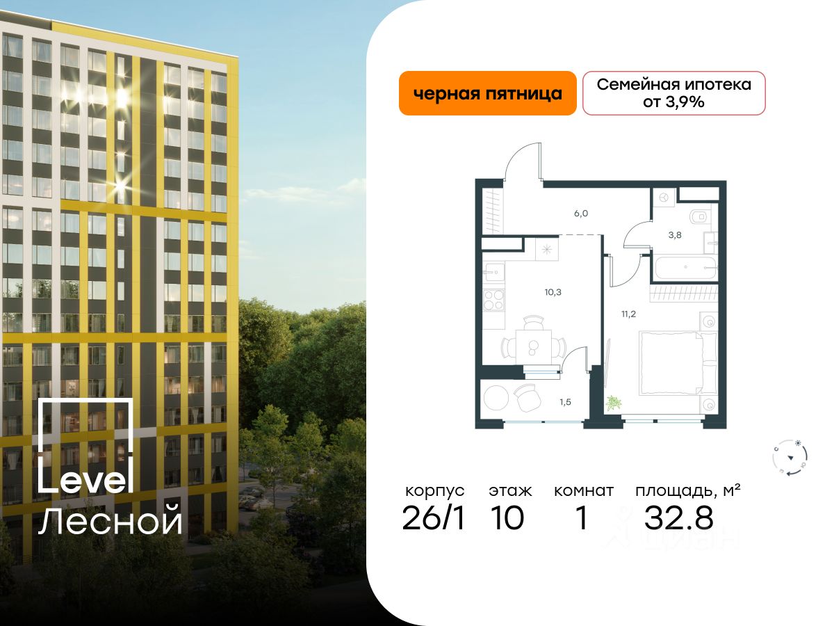 В районе, утопающем в густой зелени лесов, многочисленных парков и скверов, продаётся 1-комнатная квартира площадью 32.80 кв.м с отделкой white box. Квартира расположена на 10 этаже в жилом комплексе комфорт-класса Level Лесной (компания Level Group/Левел групп).