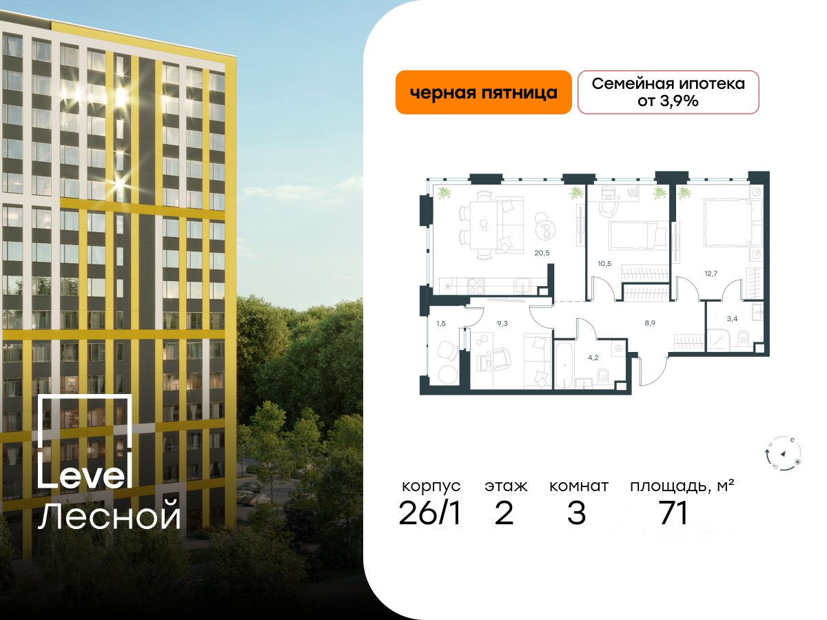 В районе, утопающем в густой зелени лесов, многочисленных парков и скверов, продаётся 3-комнатная квартира площадью 71.00 кв.м с отделкой white box. Квартира расположена на 2 этаже в жилом комплексе комфорт-класса Level Лесной (компания Level Group/Левел групп).
