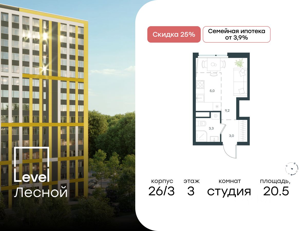 В районе, утопающем в густой зелени лесов, многочисленных парков и скверов, продаётся студия площадью 20.50 кв.м без отделки. Квартира расположена на 3 этаже в жилом комплексе комфорт-класса Level Лесной (компания Level Group/Левел групп).